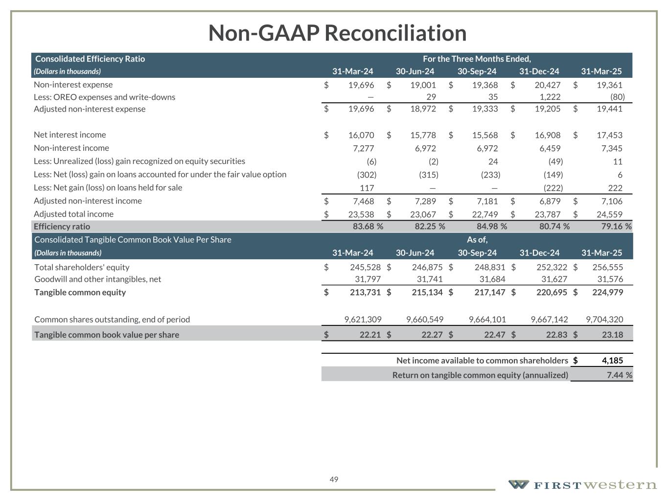 157 180 196 164 166 168 62 94 111 154 161 132 122 125 129 76 78 86 255 255 255 Chart color Table color Special Headlines Slide Headlines / Text on light background Primary Colors Secondary Colors Primary Background / Call Out Boxes / Text on dark background Chart color Table Color Tertiary Colors Chart color Table Color Chart Color Chart Color Approved Fonts AaBbCc 123 Lora (bold) Slide Headlines / Special Headlines AaBbCc 123 Lato (regular, bold, italics) Body Copy / Subheadings / Small Text Descriptions 49 Non-GAAP Reconciliation Consolidated Tangible Common Book Value Per Share As of, (Dollars in thousands) 31-Mar-24 30-Jun-24 30-Sep-24 31-Dec-24 31-Mar-25 Total shareholders' equity $ 245,528 $ 246,875 $ 248,831 $ 252,322 $ 256,555 Goodwill and other intangibles, net 31,797 31,741 31,684 31,627 31,576 Tangible common equity $ 213,731 $ 215,134 $ 217,147 $ 220,695 $ 224,979 Common shares outstanding, end of period 9,621,309 9,660,549 9,664,101 9,667,142 9,704,320 Tangible common book value per share $ 22.21 $ 22.27 $ 22.47 $ 22.83 $ 23.18 Net income available to common shareholders $ 4,185 Return on tangible common equity (annualized) 7.44 %  Consolidated Efficiency Ratio For the Three Months Ended, (Dollars in thousands) 31-Mar-24 30-Jun-24 30-Sep-24 31-Dec-24 31-Mar-25 Non-interest expense $ 19,696 $ 19,001 $ 19,368 $ 20,427 $ 19,361 Less: OREO expenses and write-downs — 29 35 1,222 (80) Adjusted non-interest expense $ 19,696 $ 18,972 $ 19,333 $ 19,205 $ 19,441 Net interest income $ 16,070 $ 15,778 $ 15,568 $ 16,908 $ 17,453 Non-interest income 7,277 6,972 6,972 6,459 7,345 Less: Unrealized (loss) gain recognized on equity securities (6) (2) 24 (49) 11 Less: Net (loss) gain on loans accounted for under the fair value option (302) (315) (233) (149) 6 Less: Net gain (loss) on loans held for sale 117 — — (222) 222 Adjusted non-interest income $ 7,468 $ 7,289 $ 7,181 $ 6,879 $ 7,106 Adjusted total income $ 23,538 $ 23,067 $ 22,749 $ 23,787 $ 24,559 Efficiency ratio 83.68 % 82.25 % 84.98 % 80.74 % 79.16 %