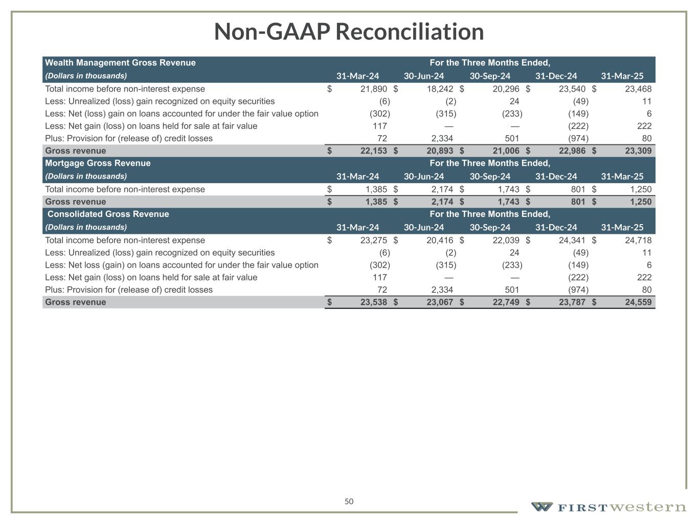 157 180 196 164 166 168 62 94 111 154 161 132 122 125 129 76 78 86 255 255 255 Chart color Table color Special Headlines Slide Headlines / Text on light background Primary Colors Secondary Colors Primary Background / Call Out Boxes / Text on dark background Chart color Table Color Tertiary Colors Chart color Table Color Chart Color Chart Color Approved Fonts AaBbCc 123 Lora (bold) Slide Headlines / Special Headlines AaBbCc 123 Lato (regular, bold, italics) Body Copy / Subheadings / Small Text Descriptions 50 Non-GAAP Reconciliation Wealth Management Gross Revenue For the Three Months Ended, (Dollars in thousands) 31-Mar-24 30-Jun-24 30-Sep-24 31-Dec-24 31-Mar-25 Total income before non-interest expense $ 21,890 $ 18,242 $ 20,296 $ 23,540 $ 23,468 Less: Unrealized (loss) gain recognized on equity securities (6) (2) 24 (49) 11 Less: Net (loss) gain on loans accounted for under the fair value option (302) (315) (233) (149) 6 Less: Net gain (loss) on loans held for sale at fair value 117 — — (222) 222 Plus: Provision for (release of) credit losses 72 2,334 501 (974) 80 Gross revenue $ 22,153 $ 20,893 $ 21,006 $ 22,986 $ 23,309 Mortgage Gross Revenue For the Three Months Ended, (Dollars in thousands) 31-Mar-24 30-Jun-24 30-Sep-24 31-Dec-24 31-Mar-25 Total income before non-interest expense $ 1,385 $ 2,174 $ 1,743 $ 801 $ 1,250 Gross revenue $ 1,385 $ 2,174 $ 1,743 $ 801 $ 1,250 Consolidated Gross Revenue For the Three Months Ended, (Dollars in thousands) 31-Mar-24 30-Jun-24 30-Sep-24 31-Dec-24 31-Mar-25 Total income before non-interest expense $ 23,275 $ 20,416 $ 22,039 $ 24,341 $ 24,718 Less: Unrealized (loss) gain recognized on equity securities (6) (2) 24 (49) 11 Less: Net loss (gain) on loans accounted for under the fair value option (302) (315) (233) (149) 6 Less: Net gain (loss) on loans held for sale at fair value 117 — — (222) 222 Plus: Provision for (release of) credit losses 72 2,334 501 (974) 80 Gross revenue $ 23,538 $ 23,067 $ 22,749 $ 23,787 $ 24,559
