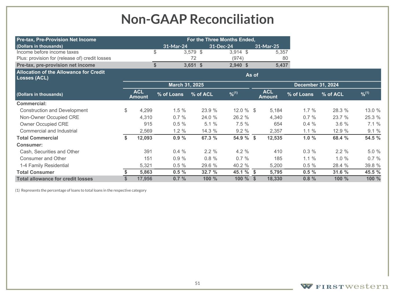157 180 196 164 166 168 62 94 111 154 161 132 122 125 129 76 78 86 255 255 255 Chart color Table color Special Headlines Slide Headlines / Text on light background Primary Colors Secondary Colors Primary Background / Call Out Boxes / Text on dark background Chart color Table Color Tertiary Colors Chart color Table Color Chart Color Chart Color Approved Fonts AaBbCc 123 Lora (bold) Slide Headlines / Special Headlines AaBbCc 123 Lato (regular, bold, italics) Body Copy / Subheadings / Small Text Descriptions 51 Non-GAAP Reconciliation Pre-tax, Pre-Provision Net Income For the Three Months Ended, (Dollars in thousands) 31-Mar-24 31-Dec-24 31-Mar-25 Income before income taxes $ 3,579 $ 3,914 $ 5,357 Plus: provision for (release of) credit losses 72 (974) 80 Pre-tax, pre-provision net income $ 3,651 $ 2,940 $ 5,437 Allocation of the Allowance for Credit Losses (ACL) As of March 31, 2025 December 31, 2024 (Dollars in thousands) ACL Amount % of Loans % of ACL %(1) ACL Amount % of Loans % of ACL %(1) Commercial: Construction and Development $ 4,299 1.5 % 23.9 % 12.0 % $ 5,184 1.7 % 28.3 % 13.0 % Non-Owner Occupied CRE 4,310 0.7 % 24.0 % 26.2 % 4,340 0.7 % 23.7 % 25.3 % Owner Occupied CRE 915 0.5 % 5.1 % 7.5 % 654 0.4 % 3.6 % 7.1 % Commercial and Industrial 2,569 1.2 % 14.3 % 9.2 % 2,357 1.1 % 12.9 % 9.1 % Total Commercial $ 12,093 0.9 % 67.3 % 54.9 % $ 12,535 1.0 % 68.4 % 54.5 % Consumer: Cash, Securities and Other 391 0.4 % 2.2 % 4.2 % 410 0.3 % 2.2 % 5.0 % Consumer and Other 151 0.9 % 0.8 % 0.7 % 185 1.1 % 1.0 % 0.7 % 1-4 Family Residential 5,321 0.5 % 29.6 % 40.2 % 5,200 0.5 % 28.4 % 39.8 % Total Consumer $ 5,863 0.5 % 32.7 % 45.1 % $ 5,795 0.5 % 31.6 % 45.5 % Total allowance for credit losses $ 17,956 0.7 % 100 % 100 % $ 18,330 0.8 % 100 % 100 % (1) Represents the percentage of loans to total loans in the respective category