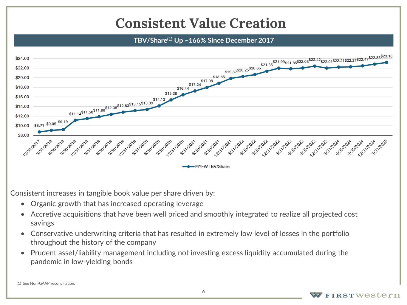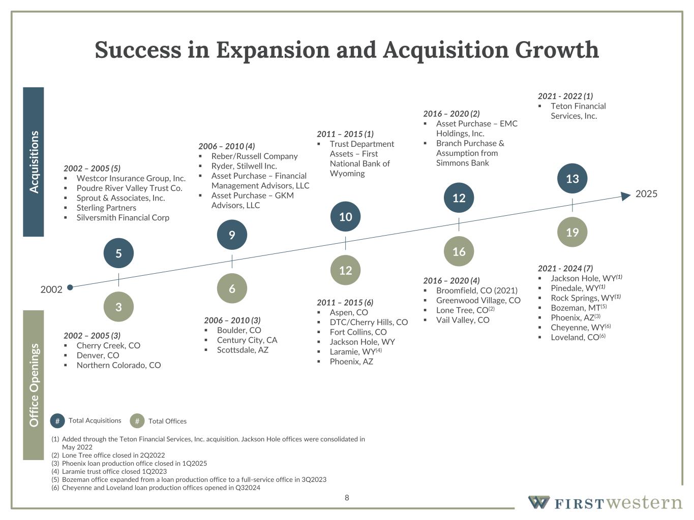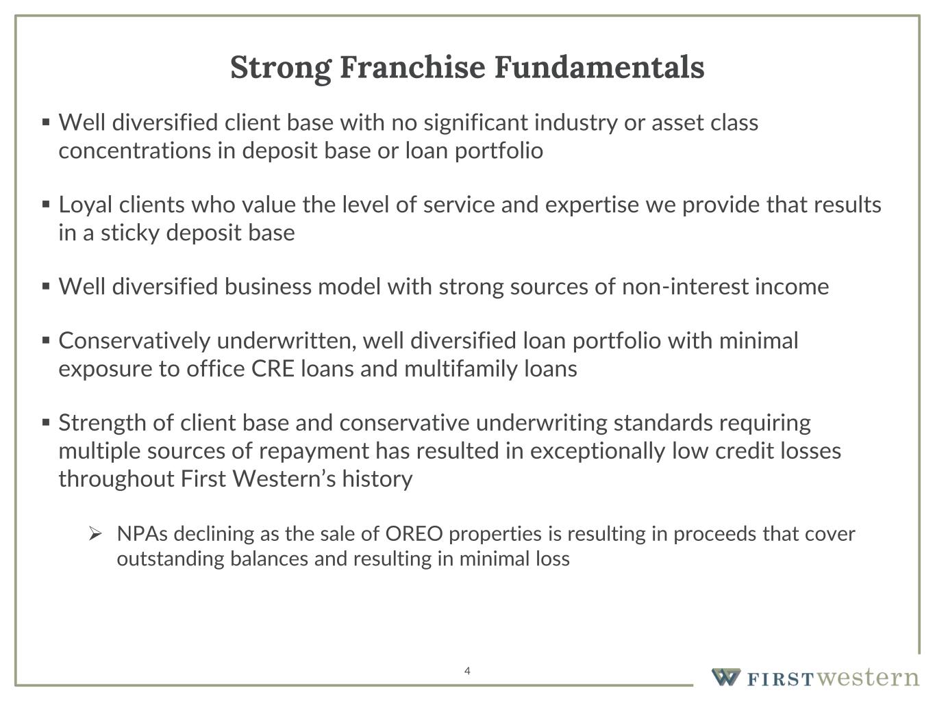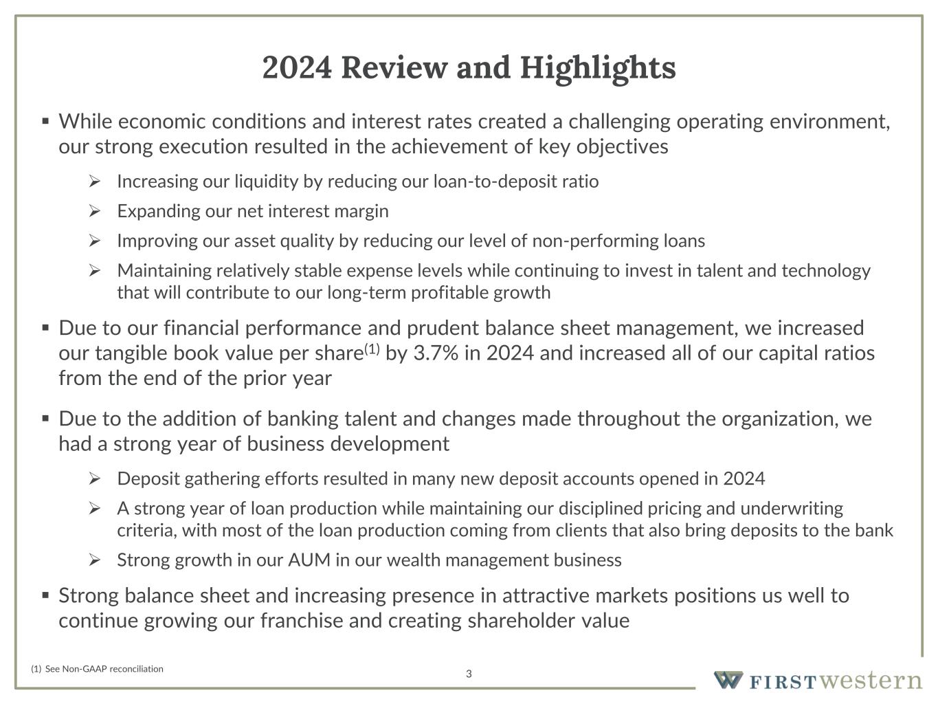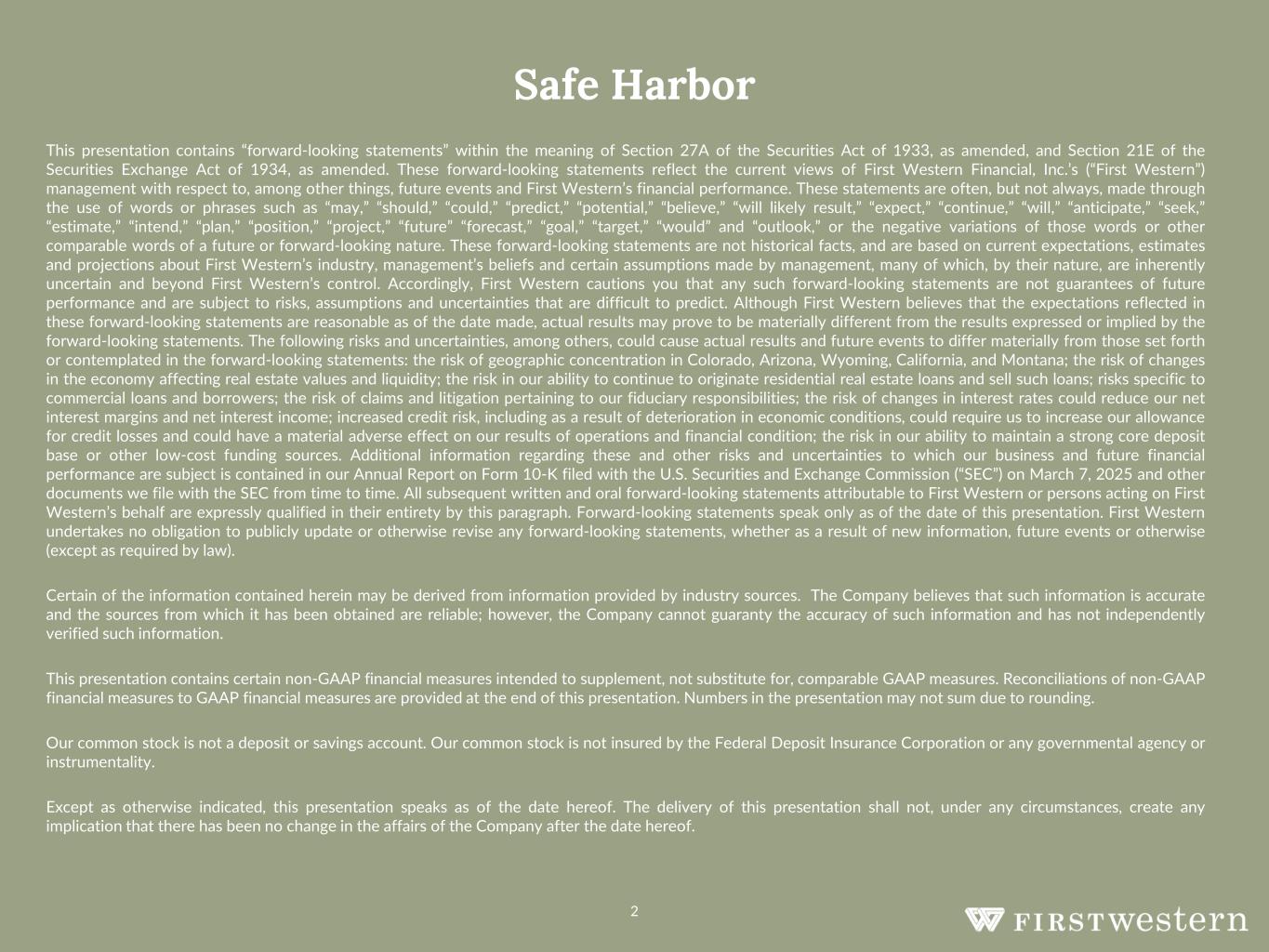 Safe Harbor 2 This presentation contains “forward-looking statements” within the meaning of Section 27A of the Securities Act of 1933, as amended, and Section 21E of the Securities Exchange Act of 1934, as amended. These forward-looking statements reflect the current views of First Western Financial, Inc.’s (“First Western”) management with respect to, among other things, future events and First Western’s financial performance. These statements are often, but not always, made through the use of words or phrases such as “may,” “should,” “could,” “predict,” “potential,” “believe,” “will likely result,” “expect,” “continue,” “will,” “anticipate,” “seek,” “estimate,” “intend,” “plan,” “position,” “project,” “future” “forecast,” “goal,” “target,” “would” and “outlook,” or the negative variations of those words or other comparable words of a future or forward-looking nature. These forward-looking statements are not historical facts, and are based on current expectations, estimates and projections about First Western’s industry, management’s beliefs and certain assumptions made by management, many of which, by their nature, are inherently uncertain and beyond First Western’s control. Accordingly, First Western cautions you that any such forward-looking statements are not guarantees of future performance and are subject to risks, assumptions and uncertainties that are difficult to predict. Although First Western believes that the expectations reflected in these forward-looking statements are reasonable as of the date made, actual results may prove to be materially different from the results expressed or implied by the forward-looking statements. The following risks and uncertainties, among others, could cause actual results and future events to differ materially from those set forth or contemplated in the forward-looking statements: the risk of geographic concentration in Colorado, Arizona, Wyoming, California, and Montana; the risk of changes in the economy affecting real estate values and liquidity; the risk in our ability to continue to originate residential real estate loans and sell such loans; risks specific to commercial loans and borrowers; the risk of claims and litigation pertaining to our fiduciary responsibilities; the risk of changes in interest rates could reduce our net interest margins and net interest income; increased credit risk, including as a result of deterioration in economic conditions, could require us to increase our allowance for credit losses and could have a material adverse effect on our results of operations and financial condition; the risk in our ability to maintain a strong core deposit base or other low-cost funding sources. Additional information regarding these and other risks and uncertainties to which our business and future financial performance are subject is contained in our Annual Report on Form 10-K filed with the U.S. Securities and Exchange Commission (“SEC”) on March 7, 2025 and other documents we file with the SEC from time to time. All subsequent written and oral forward-looking statements attributable to First Western or persons acting on First Western’s behalf are expressly qualified in their entirety by this paragraph. Forward-looking statements speak only as of the date of this presentation. First Western undertakes no obligation to publicly update or otherwise revise any forward-looking statements, whether as a result of new information, future events or otherwise (except as required by law). Certain of the information contained herein may be derived from information provided by industry sources. The Company believes that such information is accurate and the sources from which it has been obtained are reliable; however, the Company cannot guaranty the accuracy of such information and has not independently verified such information. This presentation contains certain non-GAAP financial measures intended to supplement, not substitute for, comparable GAAP measures. Reconciliations of non-GAAP financial measures to GAAP financial measures are provided at the end of this presentation. Numbers in the presentation may not sum due to rounding. Our common stock is not a deposit or savings account. Our common stock is not insured by the Federal Deposit Insurance Corporation or any governmental agency or instrumentality. Except as otherwise indicated, this presentation speaks as of the date hereof. The delivery of this presentation shall not, under any circumstances, create any implication that there has been no change in the affairs of the Company after the date hereof.