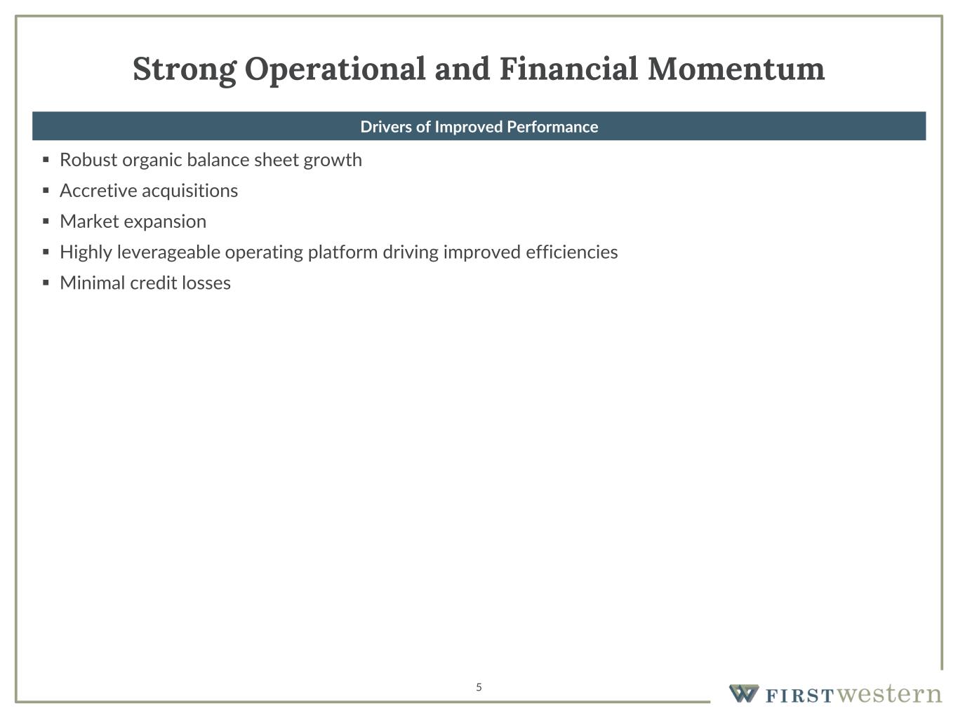 4 Strong Franchise Fundamentals ▪ Well diversified client base with no significant industry or asset class concentrations in deposit base or loan portfolio ▪ Loyal clients who value the level of service and expertise we provide that results in a sticky deposit base ▪ Well diversified business model with strong sources of non-interest income ▪ Conservatively underwritten, well diversified loan portfolio with minimal exposure to office CRE loans and multifamily loans ▪ Strength of client base and conservative underwriting standards requiring multiple sources of repayment has resulted in exceptionally low credit losses throughout First Western’s history ➢ NPAs declining as the sale of OREO properties is resulting in proceeds that cover outstanding balances and resulting in minimal loss