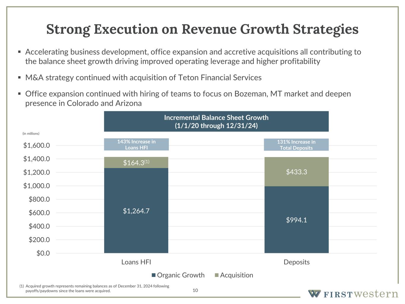 9 Revenue Growth Strategies Expand commercial loan production platform ▪ Upgraded C&I product and service capabilities ▪ Building expertise in specific vertical markets ▪ Capitalize on growing reputation to attract additional experienced commercial banking talent Expand into new markets with attractive demographics ▪ Add infill and adjacent market locations ▪ Built team and revenue base to open office in Broomfield, CO in 2021 ▪ Full-service Bozeman, MT office opened in 2023 Execute on revenue initiatives in existing markets ▪ Differentiate with local, expert, trusted teams ▪ Cross-sell MYFW’s larger offering of planning, insurance, retirement, insurance, and investment products ▪ Continue adding banking and B2B talent to further accelerate market share gains Execute on low- risk strategic transactions that add value to the MYFW franchise ▪ Execute on minimally dilutive acquisitions ▪ Leverage infrastructure through branch acquisition transactions ▪ Proactive expansion, acquisition team