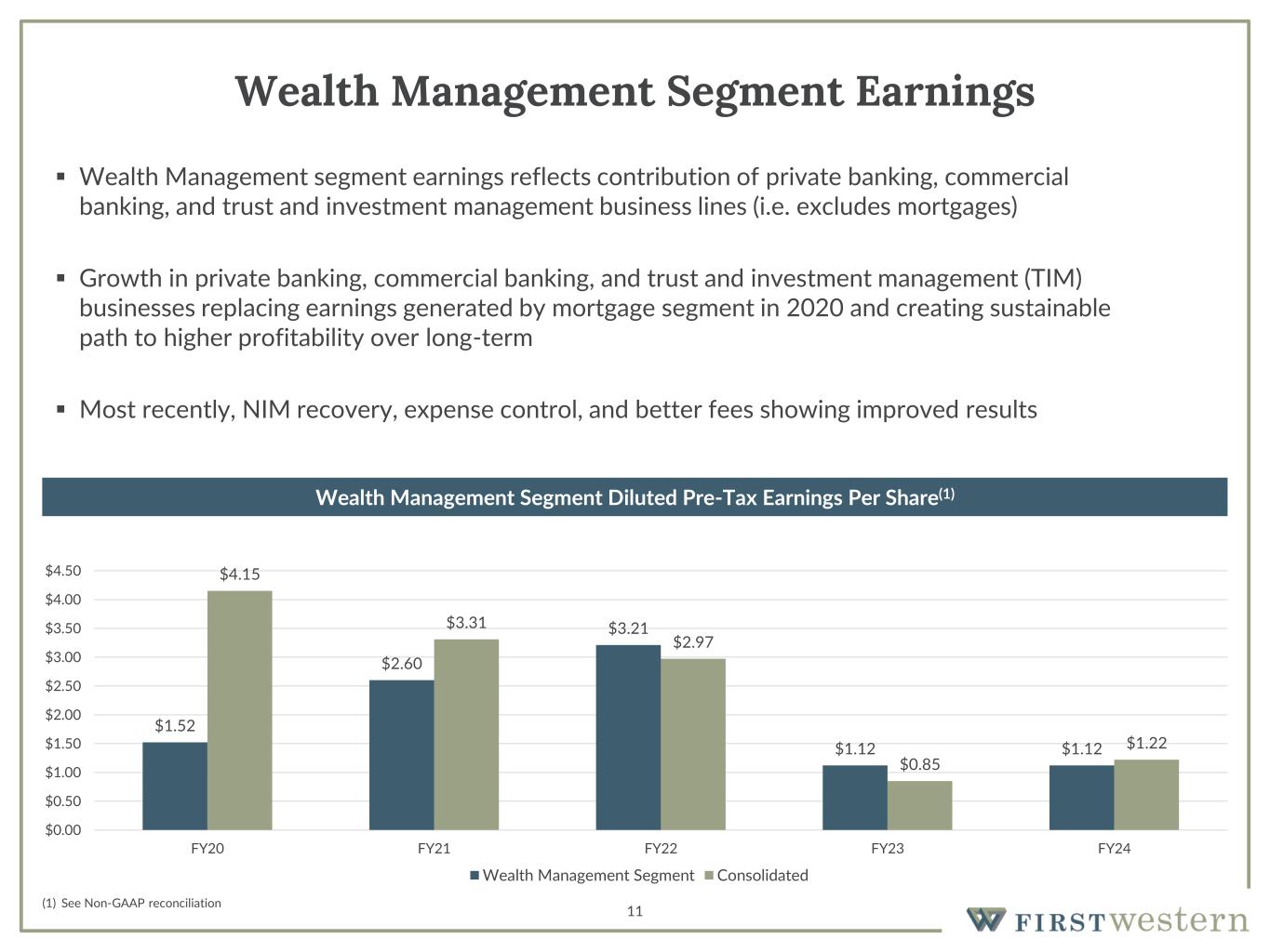 11 Wealth Management Segment Earnings (1) See Non-GAAP reconciliation $1.52 $2.60 $3.21 $1.12 $1.12 $4.15 $3.31 $2.97 $0.85 $1.22 $0.00 $0.50 $1.00 $1.50 $2.00 $2.50 $3.00 $3.50 $4.00 $4.50 FY20 FY21 FY22 FY23 FY24 Wealth Management Segment Consolidated ▪ Wealth Management segment earnings reflects contribution of private banking, commercial banking, and trust and investment management business lines (i.e. excludes mortgages) ▪ Growth in private banking, commercial banking, and trust and investment management (TIM) businesses replacing earnings generated by mortgage segment in 2020 and creating sustainable path to higher profitability over long-term ▪ Most recently, NIM recovery, expense control, and better fees showing improved results Wealth Management Segment Diluted Pre-Tax Earnings Per Share(1)