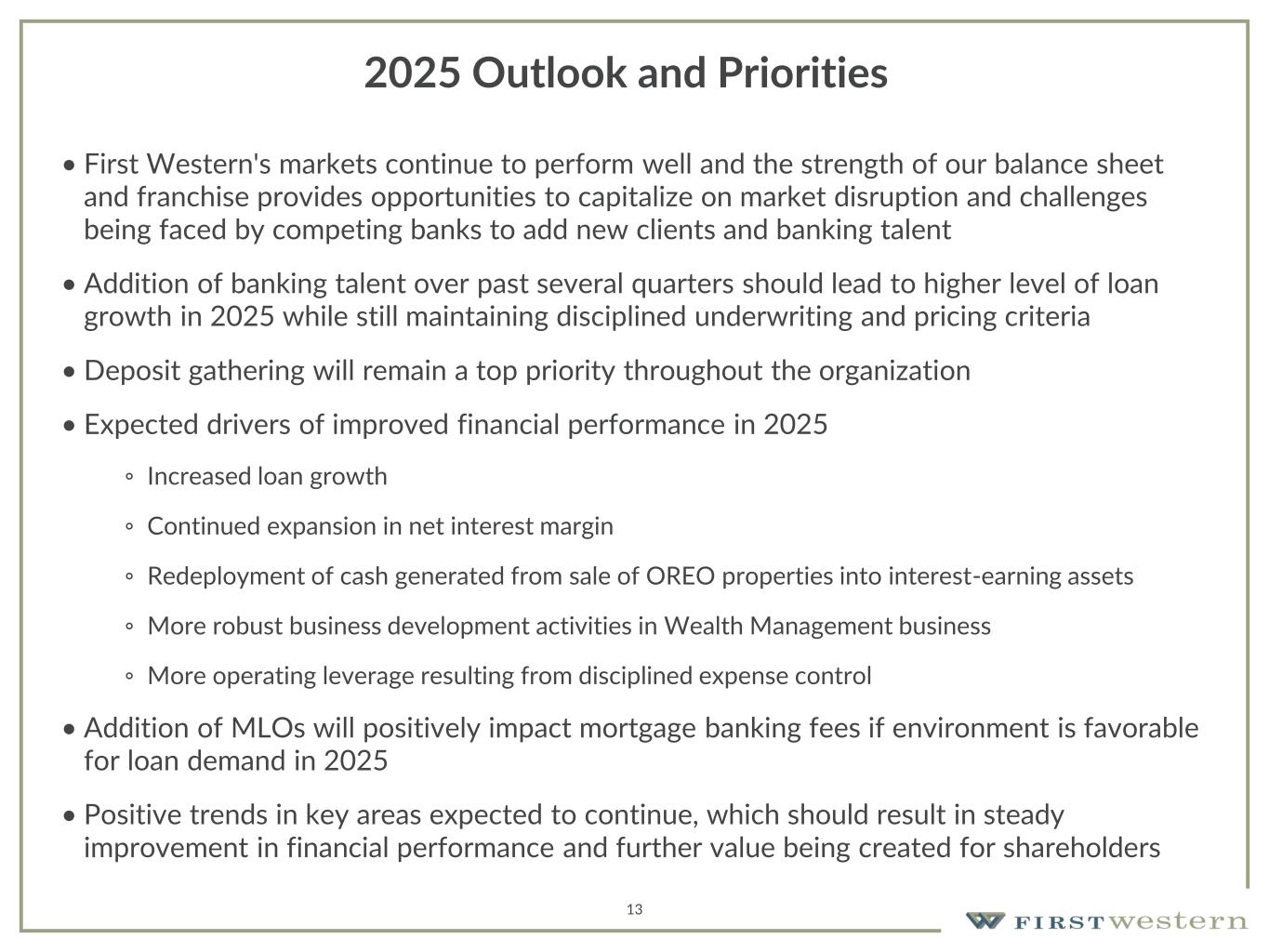 13 2025 Outlook and Priorities • First Western's markets continue to perform well and the strength of our balance sheet and franchise provides opportunities to capitalize on market disruption and challenges being faced by competing banks to add new clients and banking talent • Addition of banking talent over past several quarters should lead to higher level of loan growth in 2025 while still maintaining disciplined underwriting and pricing criteria • Deposit gathering will remain a top priority throughout the organization • Expected drivers of improved financial performance in 2025 ◦ Increased loan growth ◦ Continued expansion in net interest margin ◦ Redeployment of cash generated from sale of OREO properties into interest-earning assets ◦ More robust business development activities in Wealth Management business ◦ More operating leverage resulting from disciplined expense control • Addition of MLOs will positively impact mortgage banking fees if environment is favorable for loan demand in 2025 • Positive trends in key areas expected to continue, which should result in steady improvement in financial performance and further value being created for shareholders