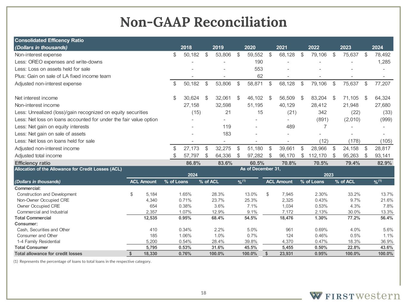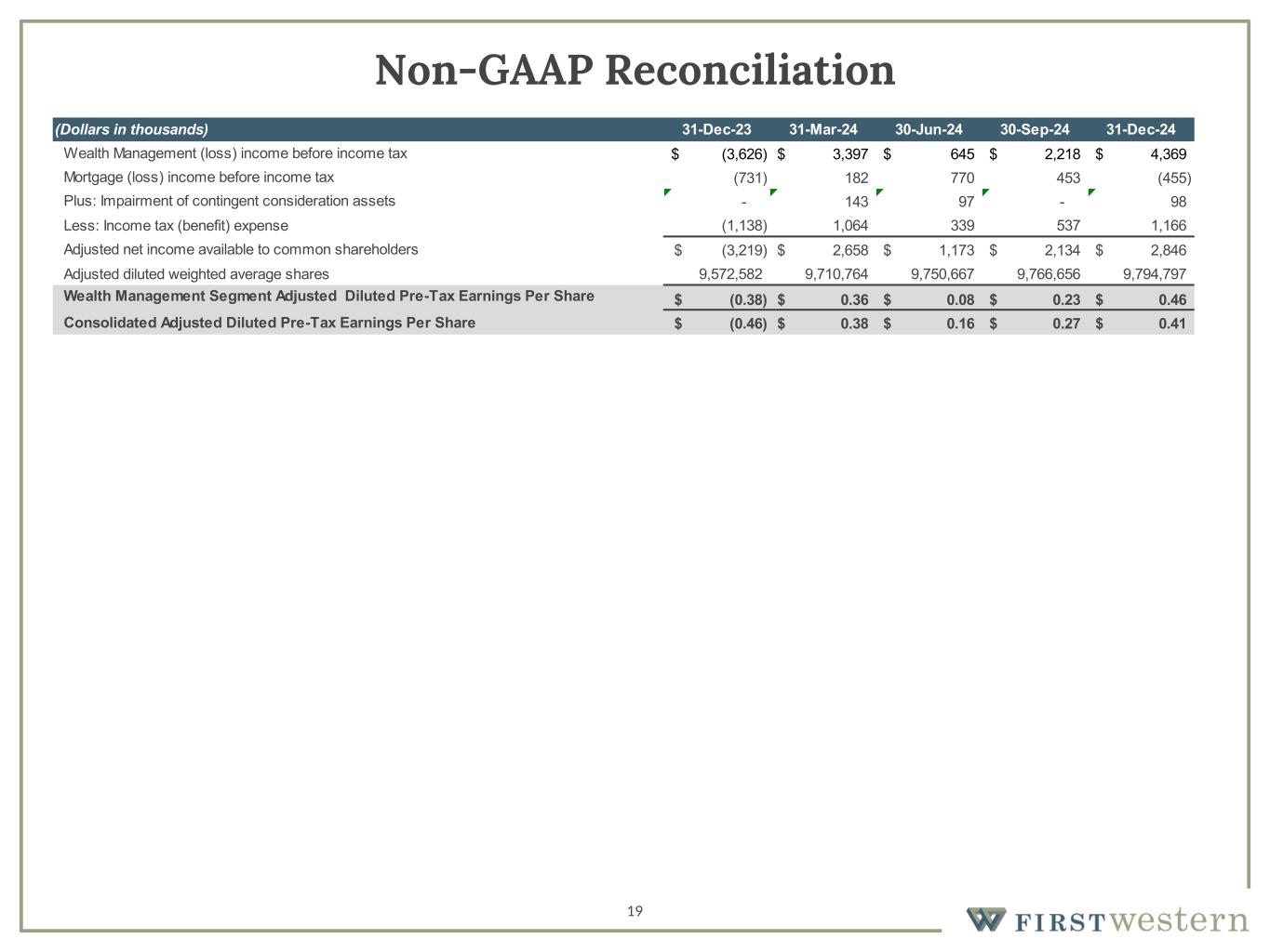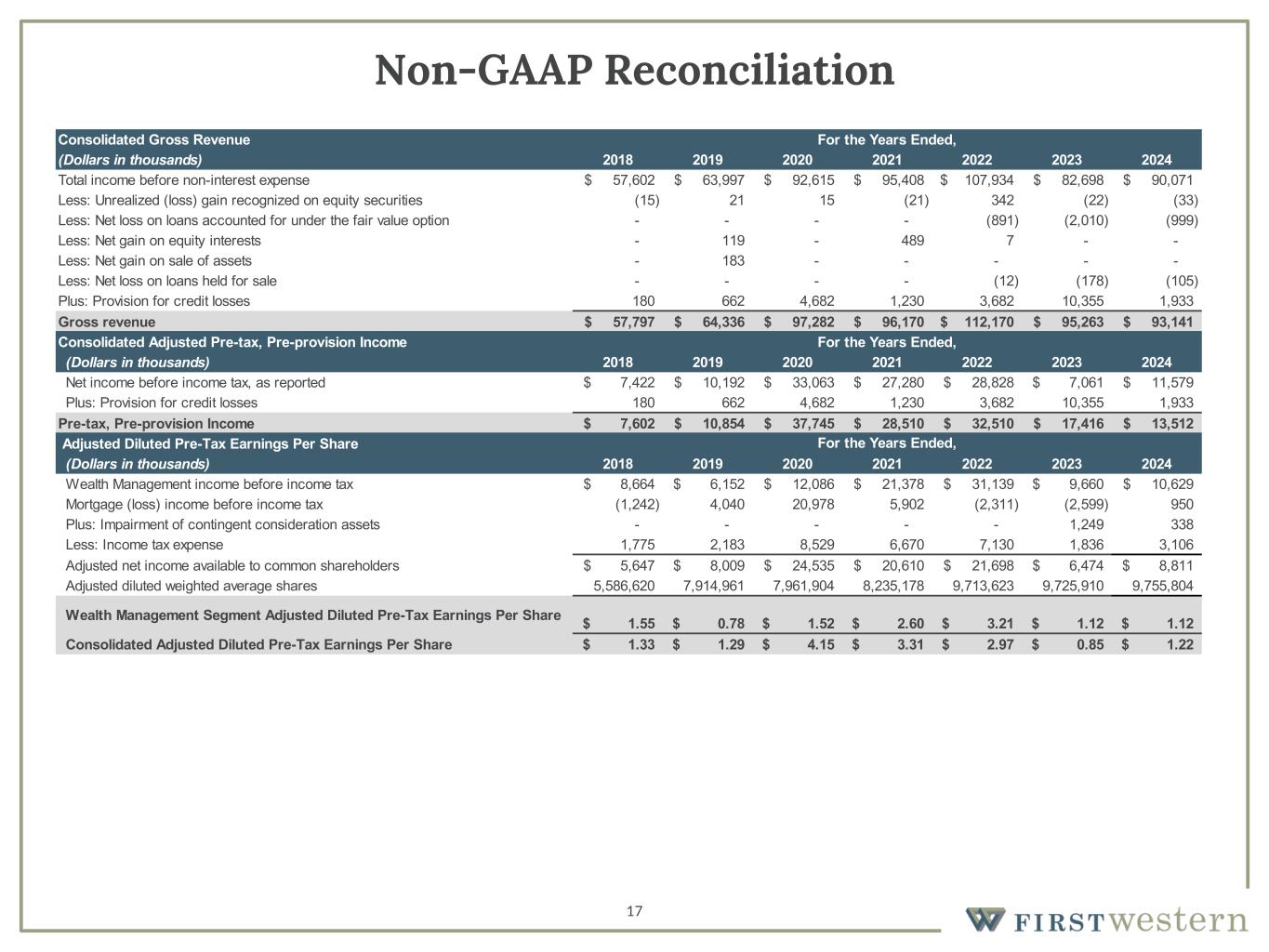 17 Non-GAAP Reconciliation Consolidated Gross Revenue For the Years Ended, (Dollars in thousands) 2018 2019 2020 2021 2022 2023 2024 Total income before non-interest expense 57,602$ 63,997$ 92,615$ 95,408$ 107,934$ 82,698$ 90,071$ Less: Unrealized (loss) gain recognized on equity securities (15) 21 15 (21) 342 (22) (33) Less: Net loss on loans accounted for under the fair value option - - - - (891) (2,010) (999) Less: Net gain on equity interests - 119 - 489 7 - - Less: Net gain on sale of assets - 183 - - - - - Less: Net loss on loans held for sale - - - - (12) (178) (105) Plus: Provision for credit losses 180 662 4,682 1,230 3,682 10,355 1,933 Gross revenue 57,797$ 64,336$ 97,282$ 96,170$ 112,170$ 95,263$ 93,141$ Consolidated Adjusted Pre-tax, Pre-provision Income For the Years Ended, (Dollars in thousands) 2018 2019 2020 2021 2022 2023 2024 Net income before income tax, as reported 7,422$ 10,192$ 33,063$ 27,280$ 28,828$ 7,061$ 11,579$ Plus: Provision for credit losses 180 662 4,682 1,230 3,682 10,355 1,933 Pre-tax, Pre-provision Income 7,602$ 10,854$ 37,745$ 28,510$ 32,510$ 17,416$ 13,512$  Adjusted Diluted Pre-Tax Earnings Per Share (Dollars in thousands) 2018 2019 2020 2021 2022 2023 2024 Wealth Management income before income tax 8,664$ 6,152$ 12,086$ 21,378$ 31,139$ 9,660$ 10,629$ Mortgage (loss) income before income tax (1,242) 4,040 20,978 5,902 (2,311) (2,599) 950 Plus: Impairment of contingent consideration assets - - - - - 1,249 338 Less: Income tax expense 1,775 2,183 8,529 6,670 7,130 1,836 3,106 Adjusted net income available to common shareholders 5,647$ 8,009$ 24,535$ 20,610$ 21,698$ 6,474$ 8,811$ Adjusted diluted weighted average shares 5,586,620 7,914,961 7,961,904 8,235,178 9,713,623 9,725,910 9,755,804 Wealth Management Segment Adjusted Diluted Pre-Tax Earnings Per Share 1.55$ 0.78$ 1.52$ 2.60$ 3.21$ 1.12$ 1.12$ Consolidated Adjusted Diluted Pre-Tax Earnings Per Share 1.33$ 1.29$ 4.15$ 3.31$ 2.97$ 0.85$ 1.22$ For the Years Ended,