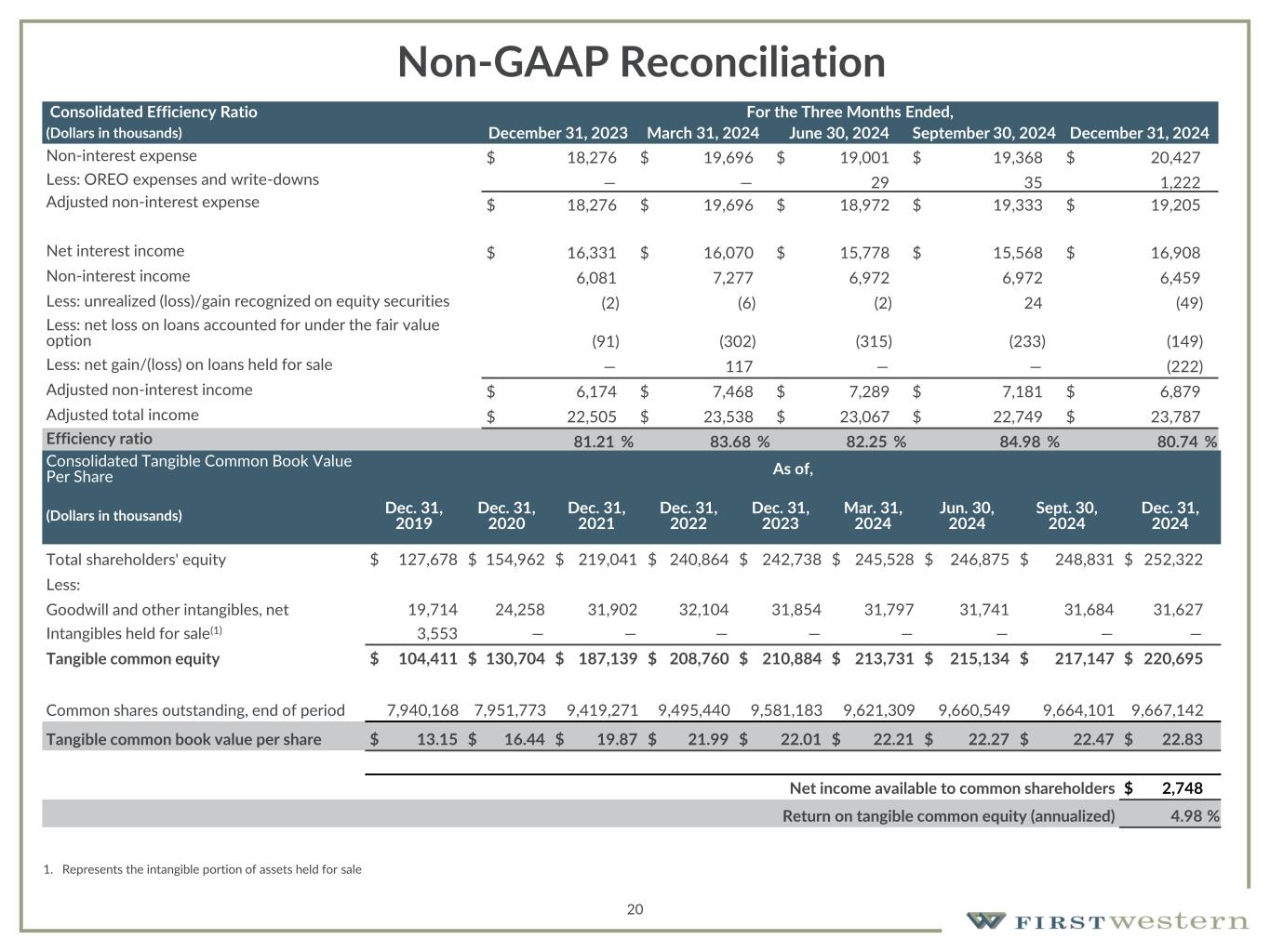 19 Non-GAAP Reconciliation (Dollars in thousands) 31-Dec-23 31-Mar-24 30-Jun-24 30-Sep-24 31-Dec-24 Wealth Management (loss) income before income tax (3,626)$ 3,397$ 645$ 2,218$ 4,369$ Mortgage (loss) income before income tax (731) 182 770 453 (455) Plus: Impairment of contingent consideration assets - 143 97 - 98 Less: Income tax (benefit) expense (1,138) 1,064 339 537 1,166 Adjusted net income available to common shareholders (3,219)$ 2,658$ 1,173$ 2,134$ 2,846$ Adjusted diluted weighted average shares 9,572,582 9,710,764 9,750,667 9,766,656 9,794,797 Wealth Management Segment Adjusted Diluted Pre-Tax Earnings Per Share (0.38)$ 0.36$ 0.08$ 0.23$ 0.46$ Consolidated Adjusted Diluted Pre-Tax Earnings Per Share (0.46)$ 0.38$ 0.16$ 0.27$ 0.41$