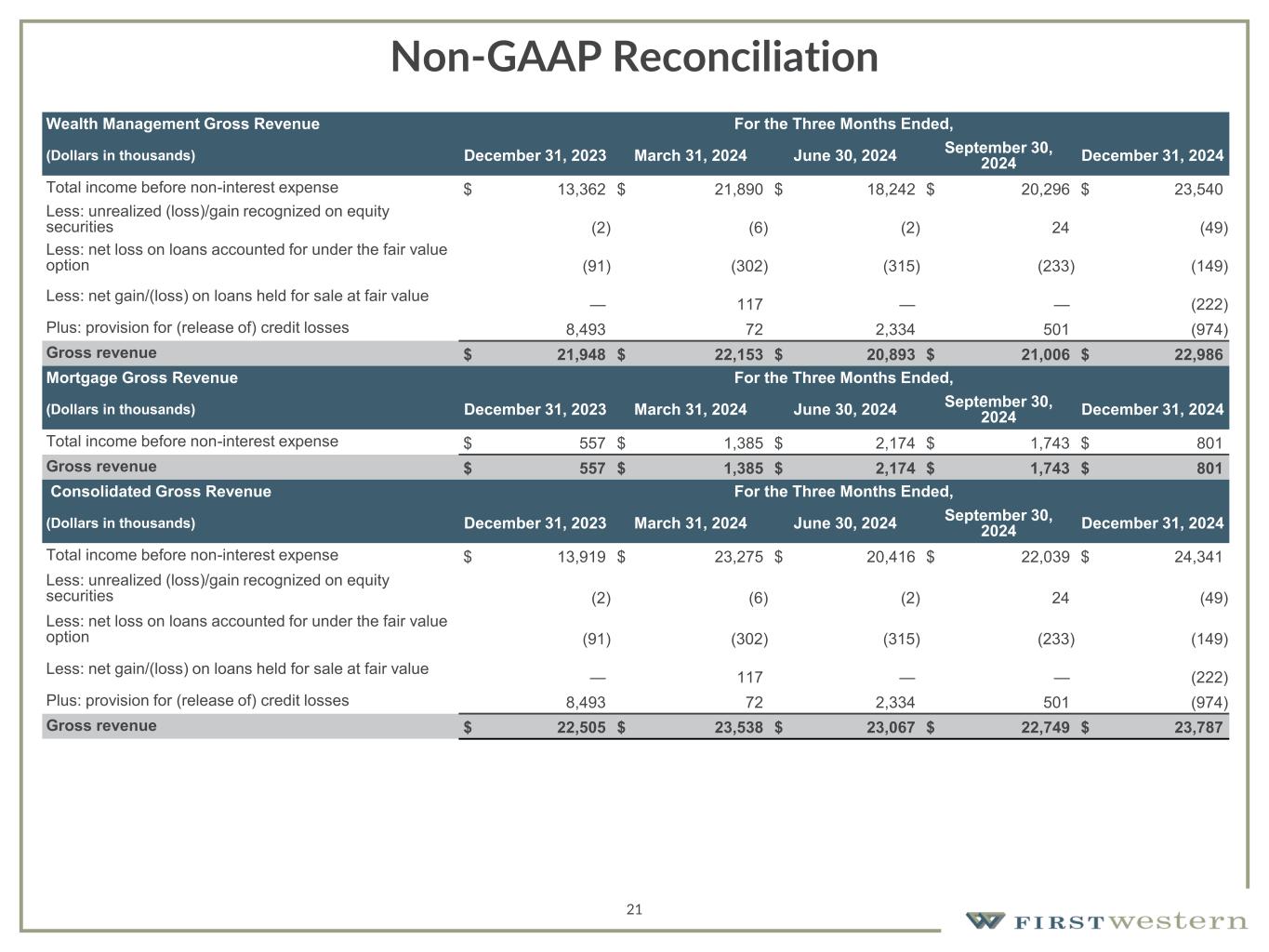 21 Non-GAAP Reconciliation Wealth Management Gross Revenue For the Three Months Ended, (Dollars in thousands) December 31, 2023 March 31, 2024 June 30, 2024 September 30, 2024 December 31, 2024 Total income before non-interest expense $ 13,362 $ 21,890 $ 18,242 $ 20,296 $ 23,540 Less: unrealized (loss)/gain recognized on equity securities (2) (6) (2) 24 (49) Less: net loss on loans accounted for under the fair value option (91) (302) (315) (233) (149) Less: net gain/(loss) on loans held for sale at fair value — 117 — — (222) Plus: provision for (release of) credit losses 8,493 72 2,334 501 (974) Gross revenue $ 21,948 $ 22,153 $ 20,893 $ 21,006 $ 22,986 Mortgage Gross Revenue For the Three Months Ended, (Dollars in thousands) December 31, 2023 March 31, 2024 June 30, 2024 September 30, 2024 December 31, 2024 Total income before non-interest expense $ 557 $ 1,385 $ 2,174 $ 1,743 $ 801 Gross revenue $ 557 $ 1,385 $ 2,174 $ 1,743 $ 801 Consolidated Gross Revenue For the Three Months Ended, (Dollars in thousands) December 31, 2023 March 31, 2024 June 30, 2024 September 30, 2024 December 31, 2024 Total income before non-interest expense $ 13,919 $ 23,275 $ 20,416 $ 22,039 $ 24,341 Less: unrealized (loss)/gain recognized on equity securities (2) (6) (2) 24 (49) Less: net loss on loans accounted for under the fair value option (91) (302) (315) (233) (149) Less: net gain/(loss) on loans held for sale at fair value — 117 — — (222) Plus: provision for (release of) credit losses 8,493 72 2,334 501 (974) Gross revenue $ 22,505 $ 23,538 $ 23,067 $ 22,749 $ 23,787