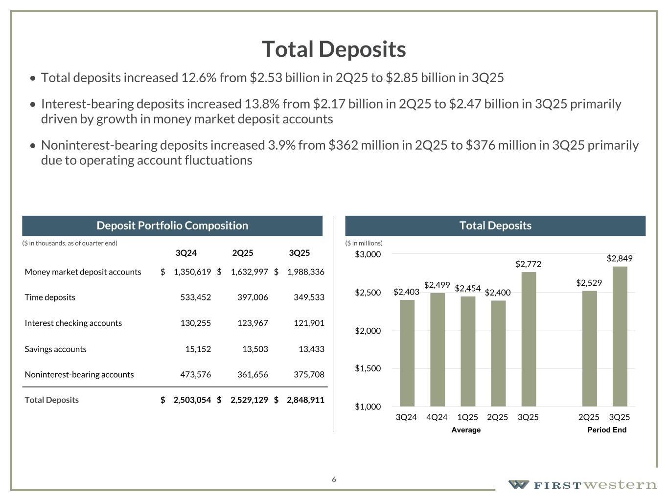 157 180 196 164 166 168 62 94 111 154 161 132 122 125 129 76 78 86 255 255 255 Chart color Table color Special Headlines Slide Headlines / Text on light background Primary Colors Secondary Colors Primary Background / Call Out Boxes / Text on dark background Chart color Table Color Tertiary Colors Chart color Table Color Chart Color Chart Color Approved Fonts AaBbCc 123 Lora (bold) Slide Headlines / Special Headlines AaBbCc 123 Lato (regular, bold, italics) Body Copy / Subheadings / Small Text Descriptions 5 Loan Portfolio • Total loans held for investment increased $50.4 million from prior quarter due to strong loan production • New loan production well diversified across markets and loan types • New loan production in 3Q25 of $145.7 million with a focus on relationship-based lending • Average rate on new loan production was 6.38% 3Q24 2Q25 3Q25 Cash, Securities and Other $ 116,856 $ 161,725 $ 159,204 Consumer and Other 14,978 15,778 12,254 Construction and Development 301,542 255,870 230,600 1-4 Family Residential 920,709 1,012,662 1,041,990 Non-Owner Occupied CRE 608,494 655,954 728,039 Owner Occupied CRE 176,165 196,692 191,239 Commercial and Industrial 239,660 239,278 225,919 Total $ 2,378,404 $ 2,537,959 $ 2,589,245 Loans accounted for at fair value(2) 8,884 5,235 4,319 Total Loans HFI $ 2,387,288 $ 2,543,194 $ 2,593,564 Mortgage loans held for sale 12,324 24,151 21,806 Loans held for sale 473 — — Total Loans $ 2,400,085 $ 2,567,345 $ 2,615,370 (1) Represents unpaid principal balance. Excludes deferred (fees) costs and unamortized premium/ (unaccreted discount). (2) Excludes fair value adjustments on loans accounted for under the fair value option. ($ in thousands, as of quarter end) Loan Portfolio Composition(1) Loan Portfolio Details Loan Production & Loan Payoffs Total Loans(1) $2,458 $2,421 $2,428 $2,468 $2,594 $2,567 $2,615 3Q24 4Q24 1Q25 2Q25 3Q25 2Q25 3Q25 $1,000 $1,500 $2,000 $2,500 $3,000 Average Period End $82.8 $93.5 $70.8 $166.9 $145.7$153.8 $97.1 $71.6 $122.6 $110.1 Production Loan Payoffs 3Q24 4Q24 1Q25 2Q25 3Q25 $0 $50 $100 $150 $200 ($ in millions) ($ in millions)