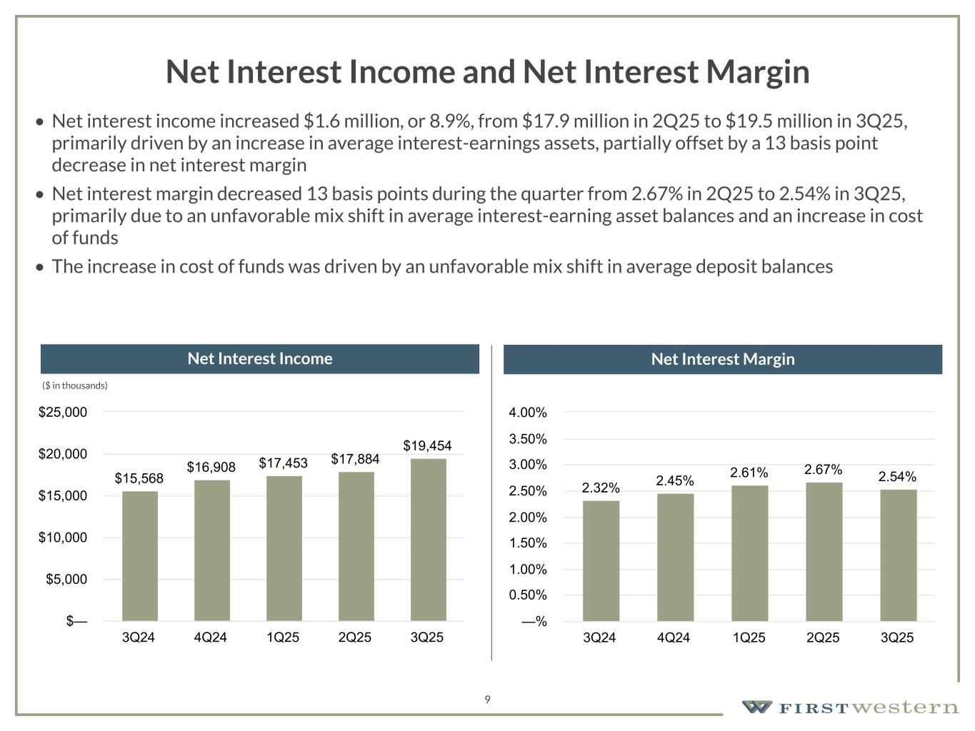 157 180 196 164 166 168 62 94 111 154 161 132 122 125 129 76 78 86 255 255 255 Chart color Table color Special Headlines Slide Headlines / Text on light background Primary Colors Secondary Colors Primary Background / Call Out Boxes / Text on dark background Chart color Table Color Tertiary Colors Chart color Table Color Chart Color Chart Color Approved Fonts AaBbCc 123 Lora (bold) Slide Headlines / Special Headlines AaBbCc 123 Lato (regular, bold, italics) Body Copy / Subheadings / Small Text Descriptions (1) See Non-GAAP reconciliation within the appendix. Gross Revenue Gross Revenue(1) Gross Revenue(1) 8 $22.7 $23.8 $24.6 $24.2 $26.3 Wealth Management Mortgage 3Q24 4Q24 1Q25 2Q25 3Q25 $— $5.0 $10.0 $15.0 $20.0 $25.0 $30.0 $35.0 • Gross revenue(1) increased 8.7% from $24.2 million in 2Q25 to $26.3 million in 3Q25 • Net interest income increased 8.9% from prior quarter primarily driven by an increase in average interest- earnings assets, partially offset by a 13 basis point decrease in net interest margin • Non-interest income increased $0.5 million from prior quarter primarily driven by increases in Net gain on mortgage loans, Risk management and insurance fees, and Trust and investment management fees Non-interest Income $6,842 26.0% Net Interest Income $19,454 74.0% ($ in thousands) ($ in millions)