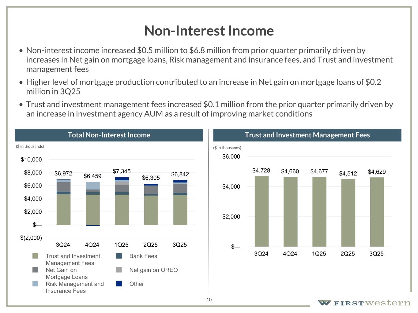 157 180 196 164 166 168 62 94 111 154 161 132 122 125 129 76 78 86 255 255 255 Chart color Table color Special Headlines Slide Headlines / Text on light background Primary Colors Secondary Colors Primary Background / Call Out Boxes / Text on dark background Chart color Table Color Tertiary Colors Chart color Table Color Chart Color Chart Color Approved Fonts AaBbCc 123 Lora (bold) Slide Headlines / Special Headlines AaBbCc 123 Lato (regular, bold, italics) Body Copy / Subheadings / Small Text Descriptions 9 Net Interest Income and Net Interest Margin • Net interest income increased $1.6 million, or 8.9%, from $17.9 million in 2Q25 to $19.5 million in 3Q25, primarily driven by an increase in average interest-earnings assets, partially offset by a 13 basis point decrease in net interest margin • Net interest margin decreased 13 basis points during the quarter from 2.67% in 2Q25 to 2.54% in 3Q25, primarily due to an unfavorable mix shift in average interest-earning asset balances and an increase in cost of funds • The increase in cost of funds was driven by an unfavorable mix shift in average deposit balances Net Interest Income Net Interest Margin $15,568 $16,908 $17,453 $17,884 $19,454 3Q24 4Q24 1Q25 2Q25 3Q25 $— $5,000 $10,000 $15,000 $20,000 $25,000 2.32% 2.45% 2.61% 2.67% 2.54% 3Q24 4Q24 1Q25 2Q25 3Q25 —% 0.50% 1.00% 1.50% 2.00% 2.50% 3.00% 3.50% 4.00% ($ in thousands)