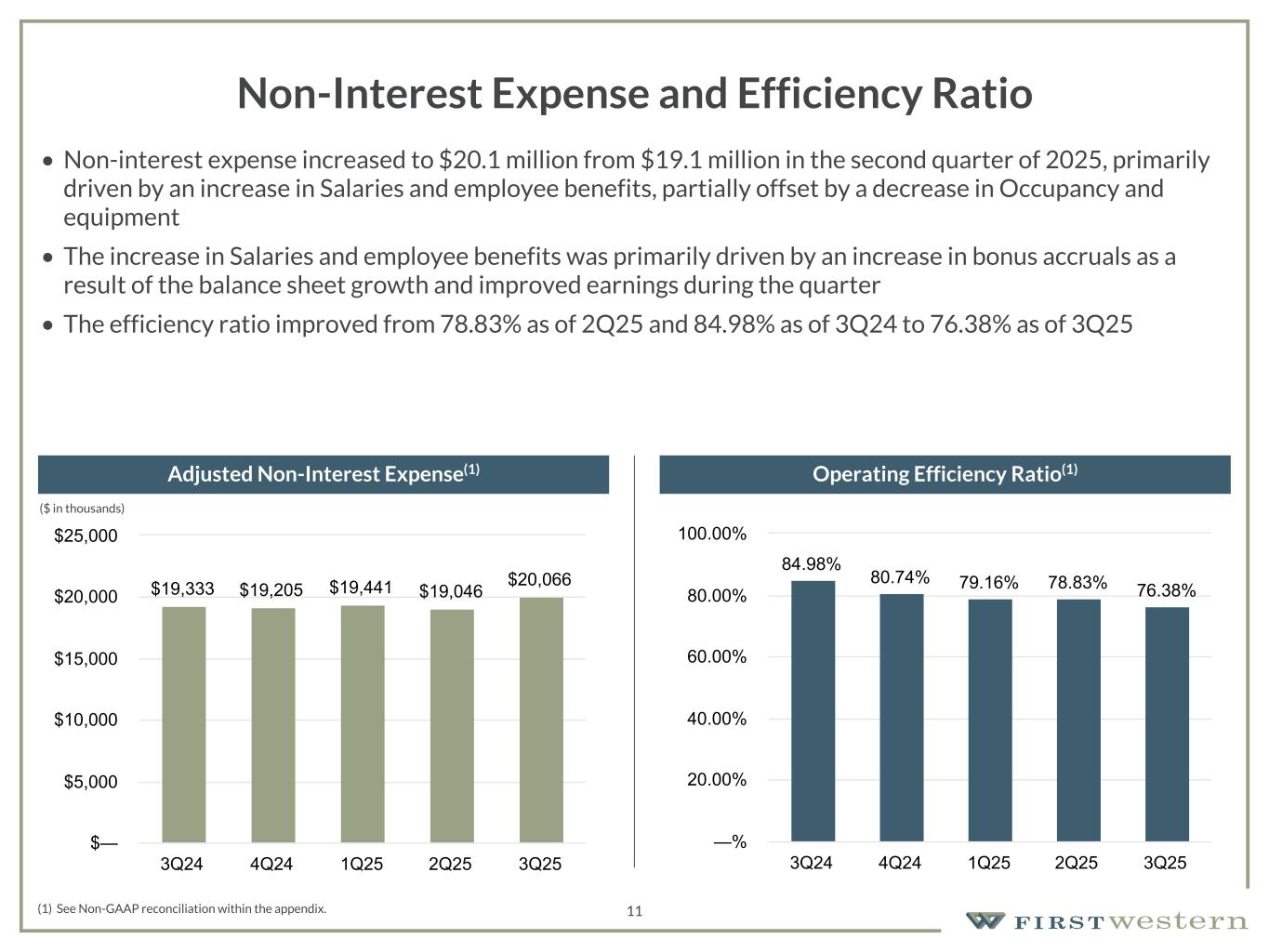 157 180 196 164 166 168 62 94 111 154 161 132 122 125 129 76 78 86 255 255 255 Chart color Table color Special Headlines Slide Headlines / Text on light background Primary Colors Secondary Colors Primary Background / Call Out Boxes / Text on dark background Chart color Table Color Tertiary Colors Chart color Table Color Chart Color Chart Color Approved Fonts AaBbCc 123 Lora (bold) Slide Headlines / Special Headlines AaBbCc 123 Lato (regular, bold, italics) Body Copy / Subheadings / Small Text Descriptions 10 Non-Interest Income • Non-interest income increased $0.5 million to $6.8 million from prior quarter primarily driven by increases in Net gain on mortgage loans, Risk management and insurance fees, and Trust and investment management fees • Higher level of mortgage production contributed to an increase in Net gain on mortgage loans of $0.2 million in 3Q25 • Trust and investment management fees increased $0.1 million from the prior quarter primarily driven by an increase in investment agency AUM as a result of improving market conditions Total Non-Interest Income Trust and Investment Management Fees $6,972 $6,459 $7,345 $6,305 $6,842 Trust and Investment Management Fees Bank Fees Net Gain on Mortgage Loans Net gain on OREO Risk Management and Insurance Fees Other 3Q24 4Q24 1Q25 2Q25 3Q25 $(2,000) $— $2,000 $4,000 $6,000 $8,000 $10,000 $4,728 $4,660 $4,677 $4,512 $4,629 3Q24 4Q24 1Q25 2Q25 3Q25 $— $2,000 $4,000 $6,000 ($ in thousands) ($ in thousands)