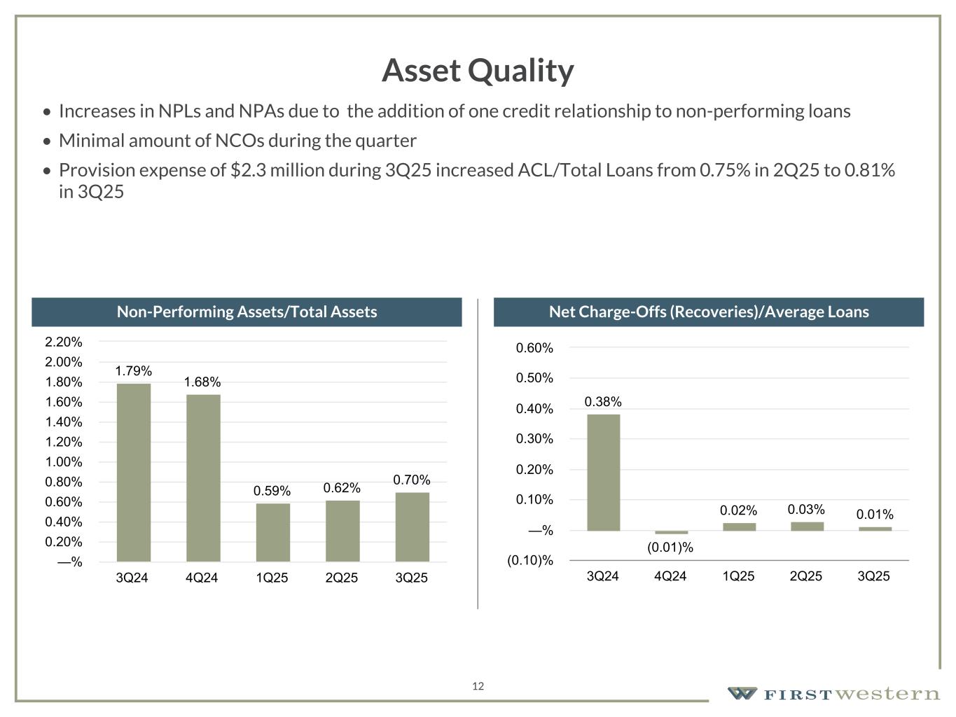 157 180 196 164 166 168 62 94 111 154 161 132 122 125 129 76 78 86 255 255 255 Chart color Table color Special Headlines Slide Headlines / Text on light background Primary Colors Secondary Colors Primary Background / Call Out Boxes / Text on dark background Chart color Table Color Tertiary Colors Chart color Table Color Chart Color Chart Color Approved Fonts AaBbCc 123 Lora (bold) Slide Headlines / Special Headlines AaBbCc 123 Lato (regular, bold, italics) Body Copy / Subheadings / Small Text Descriptions 11 Non-Interest Expense and Efficiency Ratio • Non-interest expense increased to $20.1 million from $19.1 million in the second quarter of 2025, primarily driven by an increase in Salaries and employee benefits, partially offset by a decrease in Occupancy and equipment • The increase in Salaries and employee benefits was primarily driven by an increase in bonus accruals as a result of the balance sheet growth and improved earnings during the quarter • The efficiency ratio improved from 78.83% as of 2Q25 and 84.98% as of 3Q24 to 76.38% as of 3Q25 (1) See Non-GAAP reconciliation within the appendix. Adjusted Non-Interest Expense(1) Operating Efficiency Ratio(1) (1) (1) (1) $19,333 $19,205 $19,441 $19,046 $20,066 3Q24 4Q24 1Q25 2Q25 3Q25 $— $5,000 $10,000 $15,000 $20,000 $25,000 84.98% 80.74% 79.16% 78.83% 76.38% 3Q24 4Q24 1Q25 2Q25 3Q25 —% 20.00% 40.00% 60.00% 80.00% 100.00% ($ in thousands)