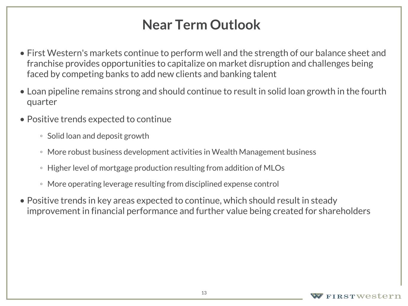 157 180 196 164 166 168 62 94 111 154 161 132 122 125 129 76 78 86 255 255 255 Chart color Table color Special Headlines Slide Headlines / Text on light background Primary Colors Secondary Colors Primary Background / Call Out Boxes / Text on dark background Chart color Table Color Tertiary Colors Chart color Table Color Chart Color Chart Color Approved Fonts AaBbCc 123 Lora (bold) Slide Headlines / Special Headlines AaBbCc 123 Lato (regular, bold, italics) Body Copy / Subheadings / Small Text Descriptions 13 Near Term Outlook • First Western's markets continue to perform well and the strength of our balance sheet and franchise provides opportunities to capitalize on market disruption and challenges being faced by competing banks to add new clients and banking talent • Loan pipeline remains strong and should continue to result in solid loan growth in the fourth quarter • Positive trends expected to continue ◦ Solid loan and deposit growth ◦ More robust business development activities in Wealth Management business ◦ Higher level of mortgage production resulting from addition of MLOs ◦ More operating leverage resulting from disciplined expense control • Positive trends in key areas expected to continue, which should result in steady improvement in financial performance and further value being created for shareholders
