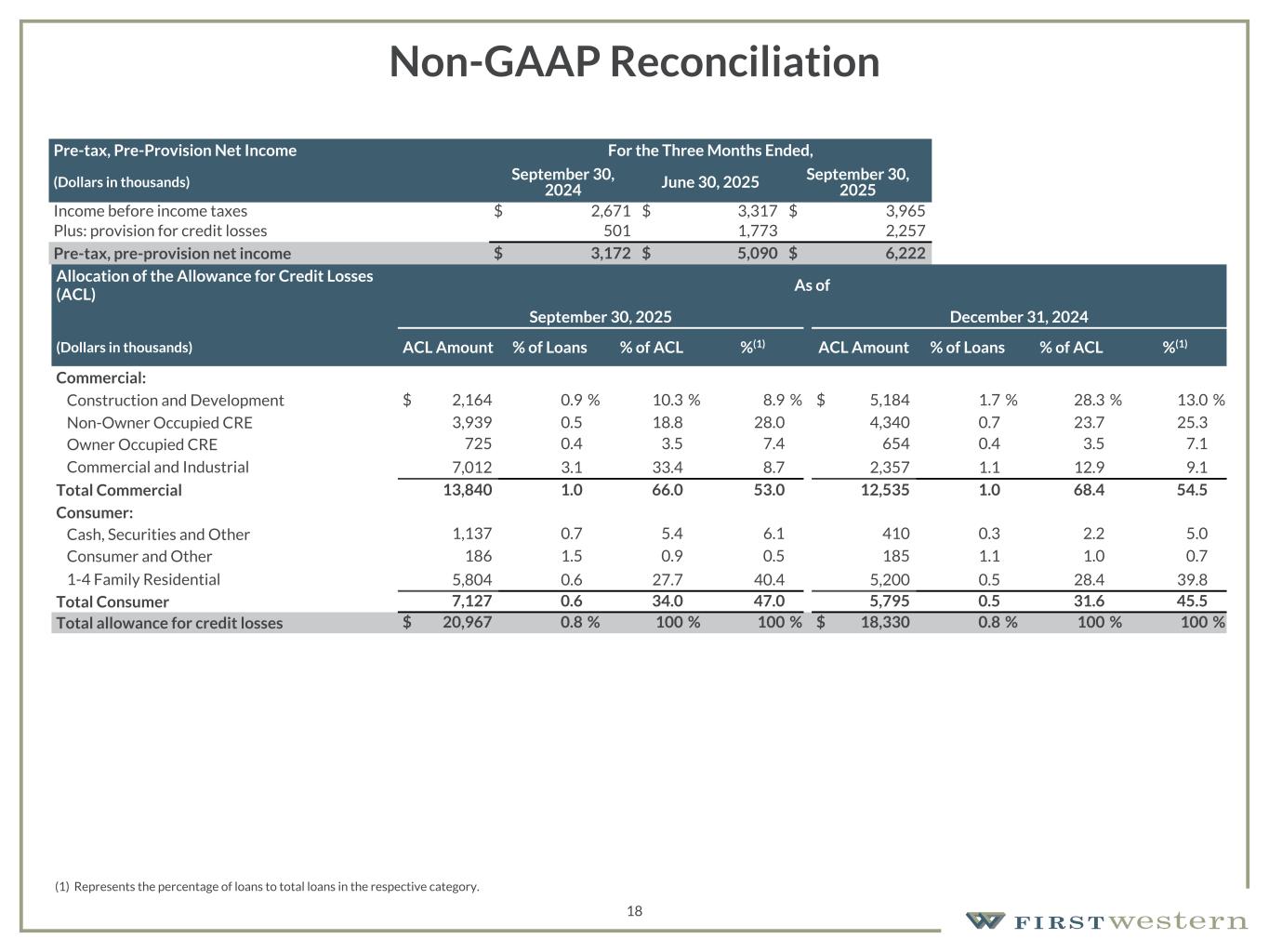 157 180 196 164 166 168 62 94 111 154 161 132 122 125 129 76 78 86 255 255 255 Chart color Table color Special Headlines Slide Headlines / Text on light background Primary Colors Secondary Colors Primary Background / Call Out Boxes / Text on dark background Chart color Table Color Tertiary Colors Chart color Table Color Chart Color Chart Color Approved Fonts AaBbCc 123 Lora (bold) Slide Headlines / Special Headlines AaBbCc 123 Lato (regular, bold, italics) Body Copy / Subheadings / Small Text Descriptions 17 Non-GAAP Reconciliation Wealth Management Gross Revenue For the Three Months Ended, (Dollars in thousands) September 30, 2024 December 31, 2024 March 31, 2025 June 30, 2025 September 30, 2025 Total income before non-interest expense $ 20,296 $ 23,540 $ 23,468 $ 20,919 $ 22,278 Less: unrealized gain (loss) recognized on equity securities 24 (49) 11 3 6 Less: net (loss) gain on loans accounted for under the fair value option (233) (149) 6 26 18 Less: net (loss) gain on loans held for sale at fair value — (222) 222 — — Plus: provision for (release of) credit losses 501 (974) 80 1,773 2,257 Gross revenue $ 21,006 $ 22,986 $ 23,309 $ 22,663 $ 24,511 Mortgage Gross Revenue For the Three Months Ended, (Dollars in thousands) September 30, 2024 December 31, 2024 March 31, 2025 June 30, 2025 September 30, 2025 Total income before non-interest expense $ 1,743 $ 801 $ 1,250 $ 1,497 $ 1,761 Gross revenue $ 1,743 $ 801 $ 1,250 $ 1,497 $ 1,761  Consolidated Gross Revenue For the Three Months Ended, (Dollars in thousands) September 30, 2024 December 31, 2024 March 31, 2025 June 30, 2025 September 30, 2025 Total income before non-interest expense $ 22,039 $ 24,341 $ 24,718 $ 22,416 $ 24,039 Less: unrealized gain (loss) recognized on equity securities 24 (49) 11 3 6 Less: net (loss) gain on loans accounted for under the fair value option (233) (149) 6 26 18 Less: net (loss) gain on loans held for sale at fair value — (222) 222 — — Plus: provision for (release of) credit losses 501 (974) 80 1,773 2,257 Gross revenue $ 22,749 $ 23,787 $ 24,559 $ 24,160 $ 26,272