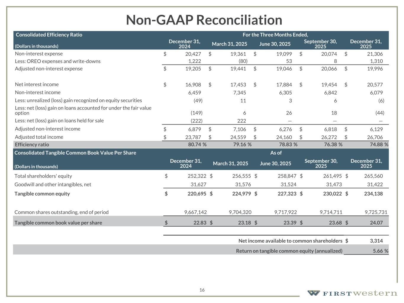 157 180 196 164 166 168 62 94 111 154 161 132 122 125 129 76 78 86 255 255 255 Chart color Table color Special Headlines Slide Headlines / Text on light background Primary Colors Secondary Colors Primary Background / Call Out Boxes / Text on dark background Chart color Table Color Tertiary Colors Chart color Table Color Chart Color Chart Color Approved Fonts AaBbCc 123 Lora (bold) Slide Headlines / Special Headlines AaBbCc 123 Lato (regular, bold, italics) Body Copy / Subheadings / Small Text Descriptions 15 Capital and Liquidity Overview Liquidity Funding Sources (as of 12/31/25) (1) See Non-GAAP reconciliation within the appendix. (2) Based on internal policy guidelines. Consolidated Capital Ratios (as of 12/31/25) Tangible Common Equity / TBV per Share(1) ($ in thousands) Liquidity Reserves: Total Available Cash $ 198,734 Unpledged Investment Securities 109,020 Borrowed Funds: Secured: FHLB Available 623,379 FRB Available 23,575 Other: Brokered Remaining Capacity 341,940 Unsecured: Credit Lines 29,000 Total Liquidity Funding Sources $ 1,325,648 Loan-to-Deposit Ratio 96.5 % 9.75% 9.75% 12.34% 7.68% Tier 1 Capital to Risk- Weighted Assets CET1 to Risk- Weighted Assets Total Capital to Risk- Weighted Assets Tier 1 Capital to Average Assets —% 2.00% 4.00% 6.00% 8.00% 10.00% 12.00% 14.00% (2) (TCE $ in thousands) $130,704 $187,139 $208,760 $210,884 $220,695 $224,979 $227,323 $230,022 $234,138 $16.44 $19.87 $21.99 $22.01 $22.83 $23.18 $23.39 $23.68 $24.07 TCE TBV/Share 4Q20 4Q21 4Q22 4Q23 4Q24 1Q25 2Q25 3Q25 4Q25 $— $40,000 $80,000 $120,000 $160,000 $200,000 $240,000 $280,000 $— $4 $8 $12 $16 $20 $24