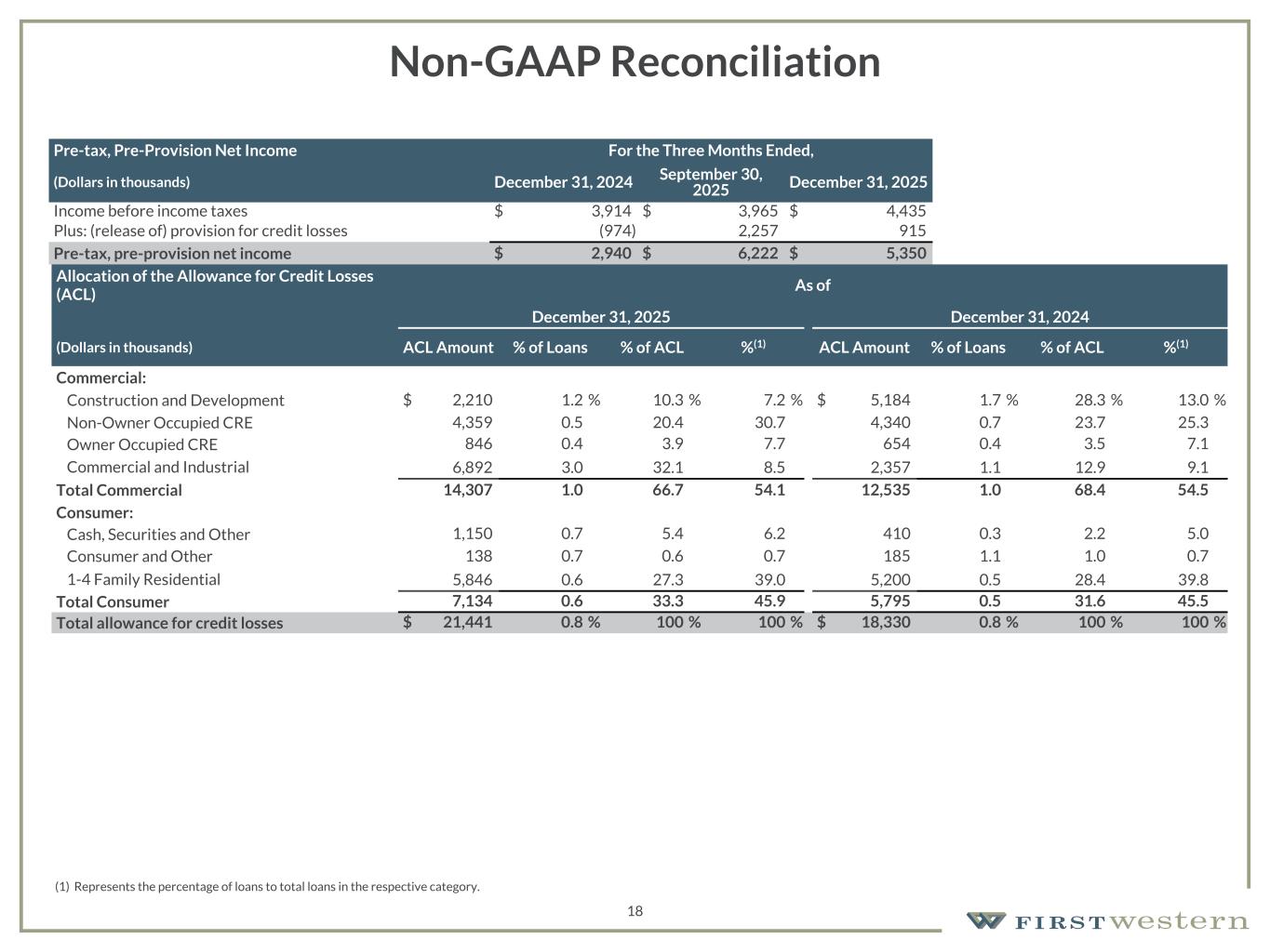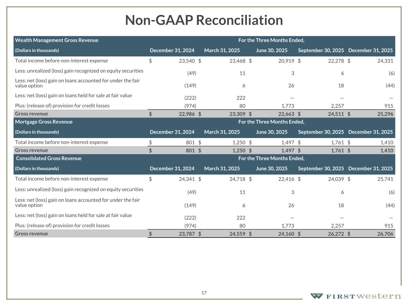 157 180 196 164 166 168 62 94 111 154 161 132 122 125 129 76 78 86 255 255 255 Chart color Table color Special Headlines Slide Headlines / Text on light background Primary Colors Secondary Colors Primary Background / Call Out Boxes / Text on dark background Chart color Table Color Tertiary Colors Chart color Table Color Chart Color Chart Color Approved Fonts AaBbCc 123 Lora (bold) Slide Headlines / Special Headlines AaBbCc 123 Lato (regular, bold, italics) Body Copy / Subheadings / Small Text Descriptions 17 Non-GAAP Reconciliation Wealth Management Gross Revenue For the Three Months Ended, (Dollars in thousands) December 31, 2024 March 31, 2025 June 30, 2025 September 30, 2025 December 31, 2025 Total income before non-interest expense $ 23,540 $ 23,468 $ 20,919 $ 22,278 $ 24,331 Less: unrealized (loss) gain recognized on equity securities (49) 11 3 6 (6) Less: net (loss) gain on loans accounted for under the fair value option (149) 6 26 18 (44) Less: net (loss) gain on loans held for sale at fair value (222) 222 — — — Plus: (release of) provision for credit losses (974) 80 1,773 2,257 915 Gross revenue $ 22,986 $ 23,309 $ 22,663 $ 24,511 $ 25,296 Mortgage Gross Revenue For the Three Months Ended, (Dollars in thousands) December 31, 2024 March 31, 2025 June 30, 2025 September 30, 2025 December 31, 2025 Total income before non-interest expense $ 801 $ 1,250 $ 1,497 $ 1,761 $ 1,410 Gross revenue $ 801 $ 1,250 $ 1,497 $ 1,761 $ 1,410  Consolidated Gross Revenue For the Three Months Ended, (Dollars in thousands) December 31, 2024 March 31, 2025 June 30, 2025 September 30, 2025 December 31, 2025 Total income before non-interest expense $ 24,341 $ 24,718 $ 22,416 $ 24,039 $ 25,741 Less: unrealized (loss) gain recognized on equity securities (49) 11 3 6 (6) Less: net (loss) gain on loans accounted for under the fair value option (149) 6 26 18 (44) Less: net (loss) gain on loans held for sale at fair value (222) 222 — — — Plus: (release of) provision for credit losses (974) 80 1,773 2,257 915 Gross revenue $ 23,787 $ 24,559 $ 24,160 $ 26,272 $ 26,706