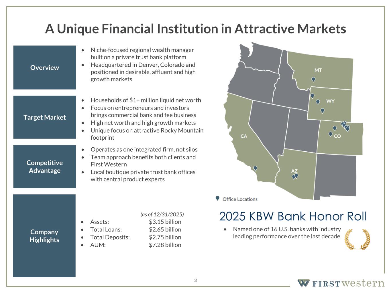 Safe Harbor 2 This presentation contains “forward-looking statements” within the meaning of Section 27A of the Securities Act of 1933, as amended, and Section 21E of the Securities Exchange Act of 1934, as amended. These forward-looking statements reflect the current views of First Western Financial, Inc.’s (“First Western”) management with respect to, among other things, future events and First Western’s financial performance. These statements are often, but not always, made through the use of words or phrases such as “may,” “should,” “could,” “predict,” “potential,” “believe,” “will likely result,” “expect,” “continue,” “will,” “anticipate,” “seek,” “estimate,” “intend,” “plan,” “position,” “project,” “future” “forecast,” “goal,” “target,” “would” and “outlook,” or the negative variations of those words or other comparable words of a future or forward-looking nature. These forward-looking statements are not historical facts, and are based on current expectations, estimates and projections about First Western’s industry, management’s beliefs and certain assumptions made by management, many of which, by their nature, are inherently uncertain and beyond First Western’s control. Accordingly, First Western cautions you that any such forward-looking statements are not guarantees of future performance and are subject to risks, assumptions and uncertainties that are difficult to predict. Although First Western believes that the expectations reflected in these forward-looking statements are reasonable as of the date made, actual results may prove to be materially different from the results expressed or implied by the forward-looking statements. The following risks and uncertainties, among others, could cause actual results and future events to differ materially from those set forth or contemplated in the forward-looking statements: the risk of geographic concentration in Colorado, Arizona, Wyoming, California, and Montana; the risk of changes in the economy affecting real estate values and liquidity; the risk in our ability to continue to originate residential real estate loans and sell such loans; risks specific to commercial loans and borrowers; the risk of claims and litigation pertaining to our fiduciary responsibilities; the risk of changes in interest rates could reduce our net interest margins and net interest income; increased credit risk, including as a result of deterioration in economic conditions, could require us to increase our allowance for credit losses and could have a material adverse effect on our results of operations and financial condition; the risk in our ability to maintain a strong core deposit base or other low-cost funding sources. Additional information regarding these and other risks and uncertainties to which our business and future financial performance are subject is contained in our Annual Report on Form 10-K filed with the U.S. Securities and Exchange Commission (“SEC”) on March 7, 2025 and other documents we file with the SEC from time to time. All subsequent written and oral forward-looking statements attributable to First Western or persons acting on First Western’s behalf are expressly qualified in their entirety by this paragraph. Forward-looking statements speak only as of the date of this presentation. First Western undertakes no obligation to publicly update or otherwise revise any forward-looking statements, whether as a result of new information, future events or otherwise (except as required by law). Certain of the information contained herein may be derived from information provided by industry sources. The Company believes that such information is accurate and the sources from which it has been obtained are reliable; however, the Company cannot guaranty the accuracy of such information and has not independently verified such information. This presentation contains certain non-GAAP financial measures intended to supplement, not substitute for, comparable GAAP measures. Reconciliations of non-GAAP financial measures to GAAP financial measures are provided at the end of this presentation. Numbers in the presentation may not sum due to rounding. Our common stock is not a deposit or savings account. Our common stock is not insured by the Federal Deposit Insurance Corporation or any governmental agency or instrumentality. Except as otherwise indicated, this presentation speaks as of the date hereof. The delivery of this presentation shall not, under any circumstances, create any implication that there has been no change in the affairs of the Company after the date hereof.