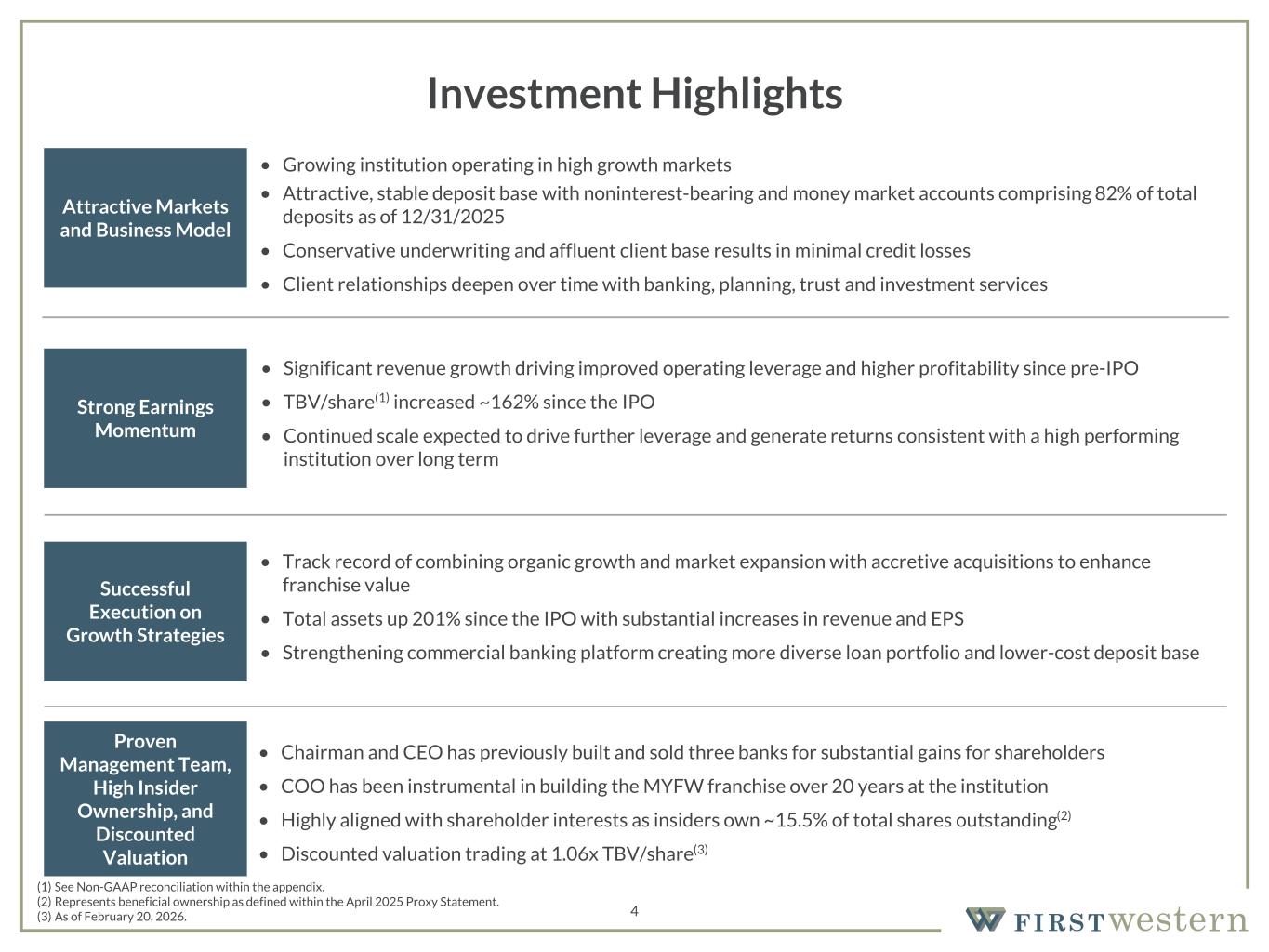 157 180 196 164 166 168 62 94 111 154 161 132 122 125 129 76 78 86 255 255 255 Chart color Table color Special Headlines Slide Headlines / Text on light background Primary Colors Secondary Colors Primary Background / Call Out Boxes / Text on dark background Chart color Table Color Tertiary Colors Chart color Table Color Chart Color Chart Color Approved Fonts AaBbCc 123 Lora (bold) Slide Headlines / Special Headlines AaBbCc 123 Lato (regular, bold, italics) Body Copy / Subheadings / Small Text Descriptions 3 A Unique Financial Institution in Attractive Markets Overview • Niche-focused regional wealth manager built on a private trust bank platform • Headquartered in Denver, Colorado and positioned in desirable, affluent and high growth markets Target Market • Households of $1+ million liquid net worth • Focus on entrepreneurs and investors brings commercial bank and fee business • High net worth and high growth markets • Unique focus on attractive Rocky Mountain footprint Company Highlights Competitive Advantage (as of 12/31/2025) • Assets: $3.15 billion • Total Loans: $2.65 billion • Total Deposits: $2.75 billion • AUM: $7.28 billion • Operates as one integrated firm, not silos • Team approach benefits both clients and First Western • Local boutique private trust bank offices with central product experts • Named one of 16 U.S. banks with industry leading performance over the last decade