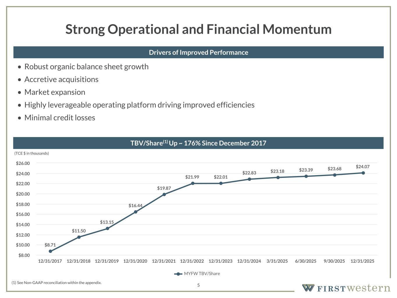 157 180 196 164 166 168 62 94 111 154 161 132 122 125 129 76 78 86 255 255 255 Chart color Table color Special Headlines Slide Headlines / Text on light background Primary Colors Secondary Colors Primary Background / Call Out Boxes / Text on dark background Chart color Table Color Tertiary Colors Chart color Table Color Chart Color Chart Color Approved Fonts AaBbCc 123 Lora (bold) Slide Headlines / Special Headlines AaBbCc 123 Lato (regular, bold, italics) Body Copy / Subheadings / Small Text Descriptions 4 Investment Highlights Successful Execution on Growth Strategies Attractive Markets and Business Model Strong Earnings Momentum • Significant revenue growth driving improved operating leverage and higher profitability since pre-IPO • TBV/share(1) increased ~162% since the IPO • Continued scale expected to drive further leverage and generate returns consistent with a high performing institution over long term • Chairman and CEO has previously built and sold three banks for substantial gains for shareholders • COO has been instrumental in building the MYFW franchise over 20 years at the institution • Highly aligned with shareholder interests as insiders own ~15.5% of total shares outstanding(2) • Discounted valuation trading at 1.06x TBV/share(3) Proven Management Team, High Insider Ownership, and Discounted Valuation • Track record of combining organic growth and market expansion with accretive acquisitions to enhance franchise value • Total assets up 201% since the IPO with substantial increases in revenue and EPS • Strengthening commercial banking platform creating more diverse loan portfolio and lower-cost deposit base • Growing institution operating in high growth markets • Attractive, stable deposit base with noninterest-bearing and money market accounts comprising 82% of total deposits as of 12/31/2025 • Conservative underwriting and affluent client base results in minimal credit losses • Client relationships deepen over time with banking, planning, trust and investment services (1) See Non-GAAP reconciliation within the appendix. (2) Represents beneficial ownership as defined within the April 2025 Proxy Statement. (3) As of February 20, 2026.