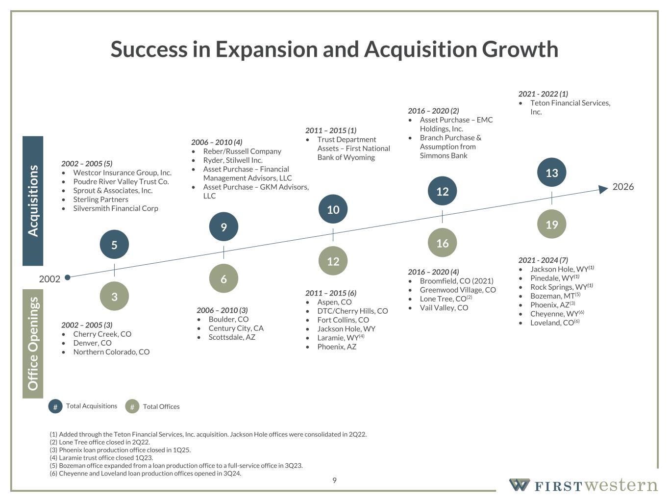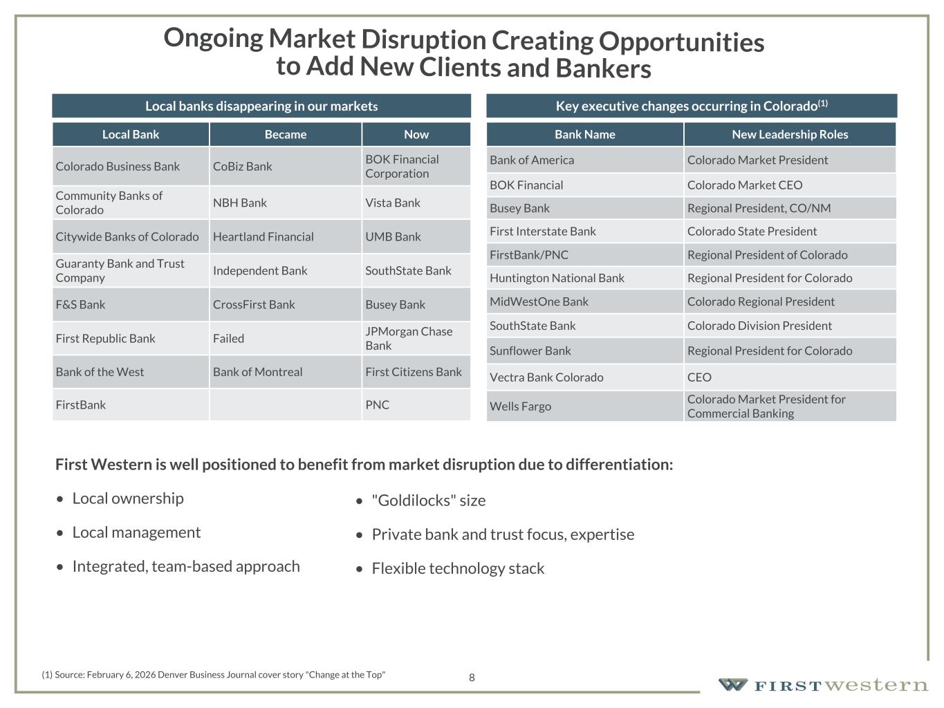 157 180 196 164 166 168 62 94 111 154 161 132 122 125 129 76 78 86 255 255 255 Chart color Table color Special Headlines Slide Headlines / Text on light background Primary Colors Secondary Colors Primary Background / Call Out Boxes / Text on dark background Chart color Table Color Tertiary Colors Chart color Table Color Chart Color Chart Color Approved Fonts AaBbCc 123 Lora (bold) Slide Headlines / Special Headlines AaBbCc 123 Lato (regular, bold, italics) Body Copy / Subheadings / Small Text Descriptions 8 Ongoing Market Disruption Creating Opportunities to Add New Clients and Bankers First Western is well positioned to benefit from market disruption due to differentiation: • Local ownership • Local management • Integrated, team-based approach Local Bank Became Now Colorado Business Bank CoBiz Bank BOK Financial Corporation Community Banks of Colorado NBH Bank Vista Bank Citywide Banks of Colorado Heartland Financial UMB Bank Guaranty Bank and Trust Company Independent Bank SouthState Bank F&S Bank CrossFirst Bank Busey Bank First Republic Bank Failed JPMorgan Chase Bank Bank of the West Bank of Montreal First Citizens Bank FirstBank PNC Bank Name New Leadership Roles Bank of America Colorado Market President BOK Financial Colorado Market CEO Busey Bank Regional President, CO/NM First Interstate Bank Colorado State President FirstBank/PNC Regional President of Colorado Huntington National Bank Regional President for Colorado MidWestOne Bank Colorado Regional President SouthState Bank Colorado Division President Sunflower Bank Regional President for Colorado Vectra Bank Colorado CEO Wells Fargo Colorado Market President for Commercial Banking Local banks disappearing in our markets Key executive changes occurring in Colorado(1) (1) Source: February 6, 2026 Denver Business Journal cover story "Change at the Top" • "Goldilocks" size • Private bank and trust focus, expertise • Flexible technology stack