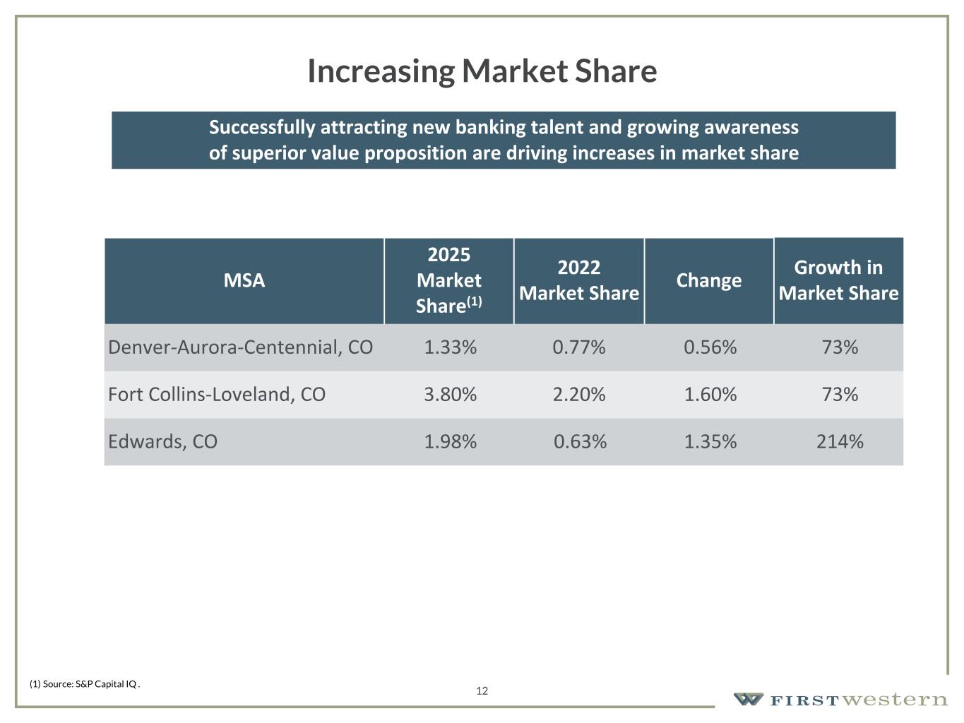 157 180 196 164 166 168 62 94 111 154 161 132 122 125 129 76 78 86 255 255 255 Chart color Table color Special Headlines Slide Headlines / Text on light background Primary Colors Secondary Colors Primary Background / Call Out Boxes / Text on dark background Chart color Table Color Tertiary Colors Chart color Table Color Chart Color Chart Color Approved Fonts AaBbCc 123 Lora (bold) Slide Headlines / Special Headlines AaBbCc 123 Lato(regular, bold, italics) Body Copy / Subheadings / Small Text Descriptions 12 Increasing Market Share Successfully attracting new banking talent and growing awareness of superior value proposition are driving increases in market share MSA 2025 Market Share(1) 2022 Market Share Change Growth in Market Share Denver-Aurora-Centennial, CO 1.33% 0.77% 0.56% 73% Fort Collins-Loveland, CO 3.80% 2.20% 1.60% 73% Edwards, CO 1.98% 0.63% 1.35% 214% (1) Source: S&P Capital IQ .