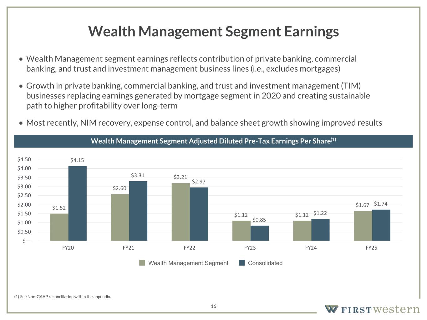 157 180 196 164 166 168 62 94 111 154 161 132 122 125 129 76 78 86 255 255 255 Chart color Table color Special Headlines Slide Headlines / Text on light background Primary Colors Secondary Colors Primary Background / Call Out Boxes / Text on dark background Chart color Table Color Tertiary Colors Chart color Table Color Chart Color Chart Color Approved Fonts AaBbCc 123 Lora (bold) Slide Headlines / Special Headlines AaBbCc 123 Lato (regular, bold, italics) Body Copy / Subheadings / Small Text Descriptions 16 Wealth Management Segment Earnings (1) See Non-GAAP reconciliation within the appendix. • Wealth Management segment earnings reflects contribution of private banking, commercial banking, and trust and investment management business lines (i.e., excludes mortgages) • Growth in private banking, commercial banking, and trust and investment management (TIM) businesses replacing earnings generated by mortgage segment in 2020 and creating sustainable path to higher profitability over long-term • Most recently, NIM recovery, expense control, and balance sheet growth showing improved results Wealth Management Segment Adjusted Diluted Pre-Tax Earnings Per Share(1) $1.52 $2.60 $3.21 $1.12 $1.12 $1.67 $4.15 $3.31 $2.97 $0.85 $1.22 $1.74 Wealth Management Segment Consolidated FY20 FY21 FY22 FY23 FY24 FY25 $— $0.50 $1.00 $1.50 $2.00 $2.50 $3.00 $3.50 $4.00 $4.50