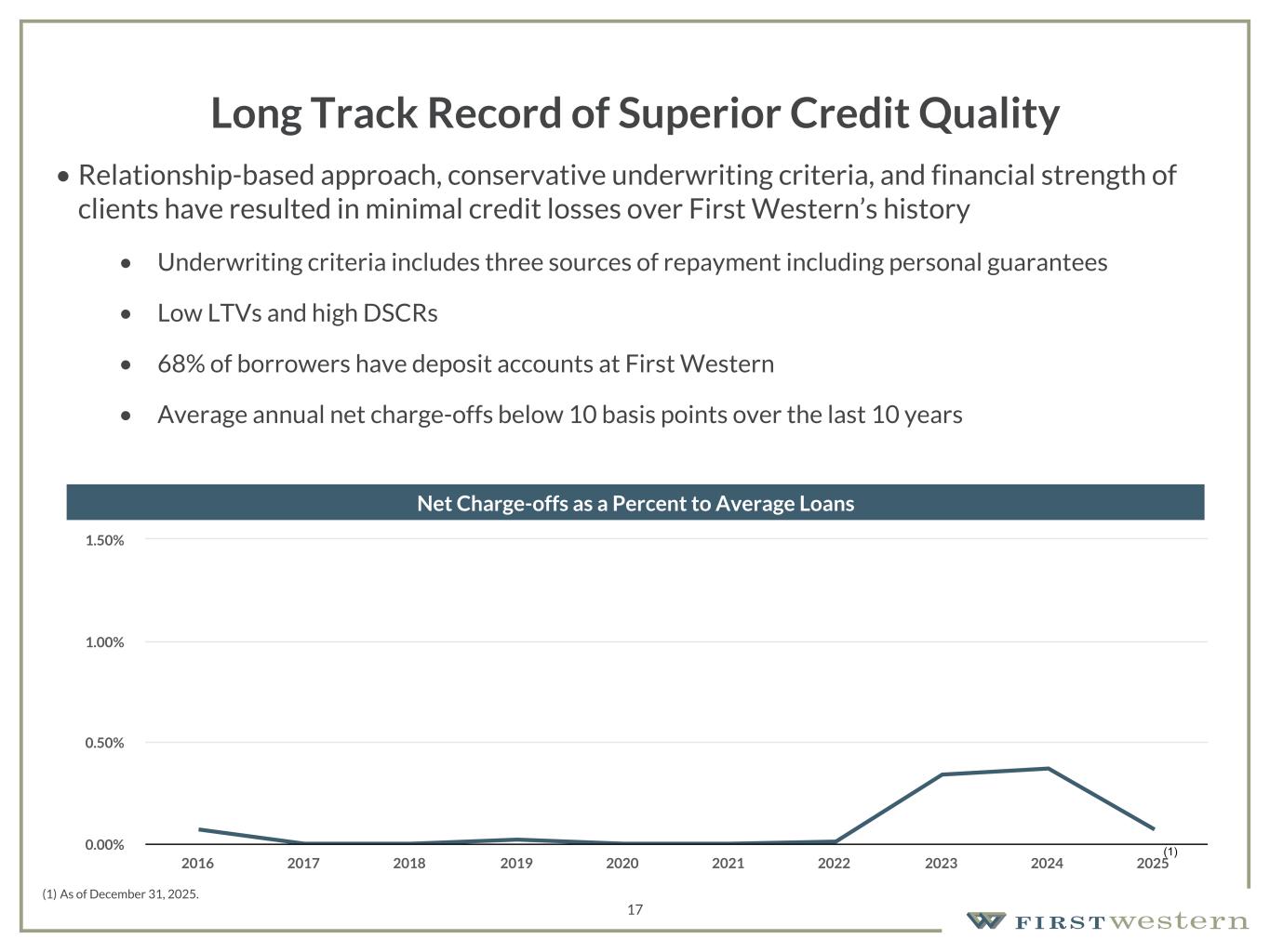 157 180 196 164 166 168 62 94 111 154 161 132 122 125 129 76 78 86 255 255 255 Chart color Table color Special Headlines Slide Headlines / Text on light background Primary Colors Secondary Colors Primary Background / Call Out Boxes / Text on dark background Chart color Table Color Tertiary Colors Chart color Table Color Chart Color Chart Color Approved Fonts AaBbCc 123 Lora (bold) Slide Headlines / Special Headlines AaBbCc 123 Lato(regular, bold, italics) Body Copy / Subheadings / Small Text Descriptions 17 Long Track Record of Superior Credit Quality • Relationship-based approach, conservative underwriting criteria, and financial strength of clients have resulted in minimal credit losses over First Western’s history • Underwriting criteria includes three sources of repayment including personal guarantees • Low LTVs and high DSCRs • 68% of borrowers have deposit accounts at First Western • Average annual net charge-offs below 10 basis points over the last 10 years Net Charge-offs as a Percent to Average Loans (1) (1) As of December 31, 2025. 2016 2017 2018 2019 2020 2021 2022 2023 2024 2025 0.00% 0.50% 1.00% 1.50%