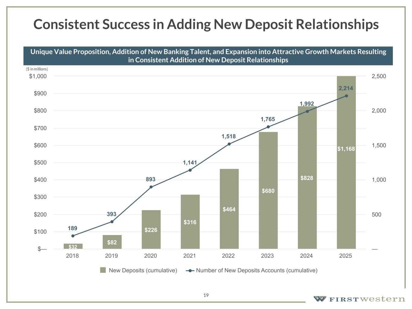 157 180 196 164 166 168 62 94 111 154 161 132 122 125 129 76 78 86 255 255 255 Chart color Table color Special Headlines Slide Headlines / Text on light background Primary Colors Secondary Colors Primary Background / Call Out Boxes / Text on dark background Chart color Table Color Tertiary Colors Chart color Table Color Chart Color Chart Color Approved Fonts AaBbCc 123 Lora (bold) Slide Headlines / Special Headlines AaBbCc 123 Lato(regular, bold, italics) Body Copy / Subheadings / Small Text Descriptions 18 Strong Client Relationships Result in Sticky Deposit Base Stable Deposit Base During Highly Volatile Period for the Banking Industry $2,392 $2,375 $2,420 $2,529 $2,532 $2,411 $2,503 $2,514 $2,515 $2,529 $2,849 $2,747 Total Deposits 1Q23 2Q23 3Q23 4Q23 1Q24 2Q24 3Q24 4Q24 1Q25 2Q25 3Q25 4Q25 $— $500 $1,000 $1,500 $2,000 $2,500 $3,000