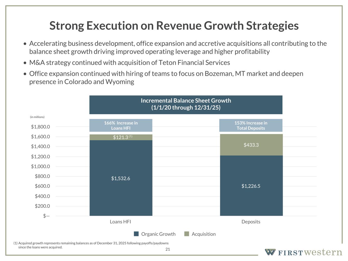 157 180 196 164 166 168 62 94 111 154 161 132 122 125 129 76 78 86 255 255 255 Chart color Table color Special Headlines Slide Headlines / Text on light background Primary Colors Secondary Colors Primary Background / Call Out Boxes / Text on dark background Chart color Table Color Tertiary Colors Chart color Table Color Chart Color Chart Color Approved Fonts AaBbCc 123 Lora (bold) Slide Headlines / Special Headlines AaBbCc 123 Lato(regular, bold, italics) Body Copy / Subheadings / Small Text Descriptions 21 Strong Execution on Revenue Growth Strategies • Accelerating business development, office expansion and accretive acquisitions all contributing to the balance sheet growth driving improved operating leverage and higher profitability • M&A strategy continued with acquisition of Teton Financial Services • Office expansion continued with hiring of teams to focus on Bozeman, MT market and deepen presence in Colorado and Wyoming (in millions) Incremental Balance Sheet Growth (1/1/20 through 12/31/25) (1) Acquired growth represents remaining balances as of December 31, 2025 following payoffs/paydowns since the loans were acquired. $1,532.6 $1,226.5 $121.3 $433.3 Organic Growth Acquisition Loans HFI Deposits $— $200.0 $400.0 $600.0 $800.0 $1,000.0 $1,200.0 $1,400.0 $1,600.0 $1,800.0 166% Increase in Loans HFI 153% Increase in Total Deposits (1)