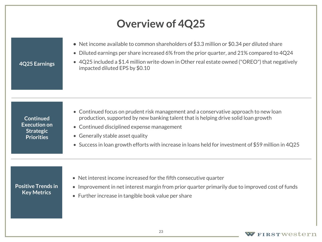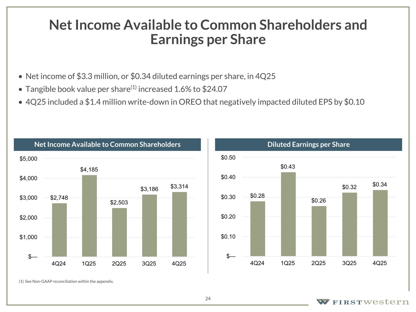 157 180 196 164 166 168 62 94 111 154 161 132 122 125 129 76 78 86 255 255 255 Chart color Table color Special Headlines Slide Headlines / Text on light background Primary Colors Secondary Colors Primary Background / Call Out Boxes / Text on dark background Chart color Table Color Tertiary Colors Chart color Table Color Chart Color Chart Color Approved Fonts AaBbCc 123 Lora (bold) Slide Headlines / Special Headlines AaBbCc 123 Lato(regular, bold, italics) Body Copy / Subheadings / Small Text Descriptions Overview of 4Q25 4Q25 Earnings • Net income available to common shareholders of $3.3 million or $0.34 per diluted share • Diluted earnings per share increased 6% from the prior quarter, and 21% compared to 4Q24 • 4Q25 included a $1.4 million write-down in Other real estate owned ("OREO") that negatively impacted diluted EPS by $0.10 Continued Execution on Strategic Priorities • Continued focus on prudent risk management and a conservative approach to new loan production, supported by new banking talent that is helping drive solid loan growth • Continued disciplined expense management • Generally stable asset quality • Success in loan growth efforts with increase in loans held for investment of $59 million in 4Q25 Positive Trends in Key Metrics • Net interest income increased for the fifth consecutive quarter • Improvement in net interest margin from prior quarter primarily due to improved cost of funds • Further increase in tangible book value per share 23