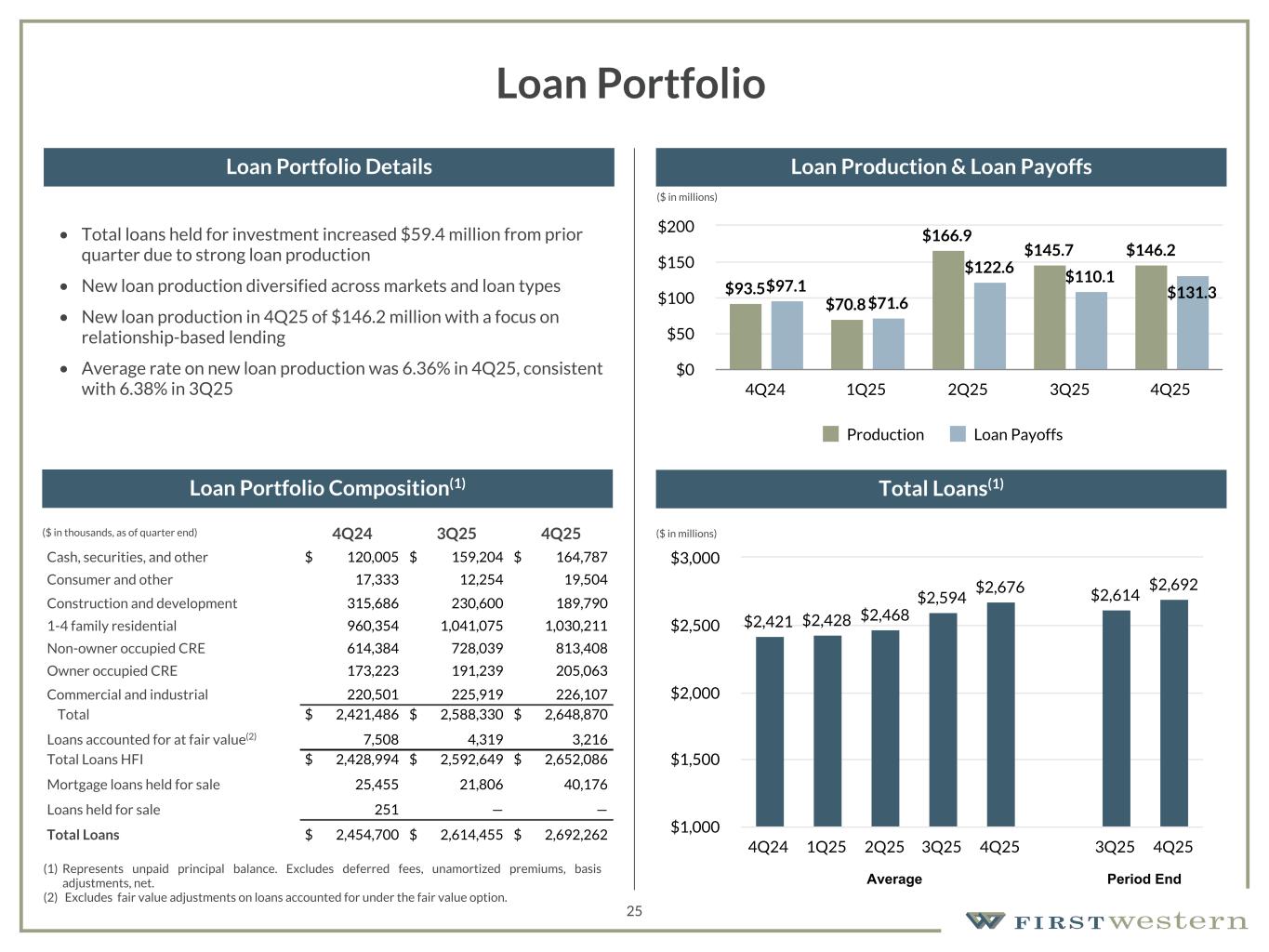 157 180 196 164 166 168 62 94 111 154 161 132 122 125 129 76 78 86 255 255 255 Chart color Table color Special Headlines Slide Headlines / Text on light background Primary Colors Secondary Colors Primary Background / Call Out Boxes / Text on dark background Chart color Table Color Tertiary Colors Chart color Table Color Chart Color Chart Color Approved Fonts AaBbCc 123 Lora (bold) Slide Headlines / Special Headlines AaBbCc 123 Lato(regular, bold, italics) Body Copy / Subheadings / Small Text Descriptions 24 Net Income Available to Common Shareholders and Earnings per Share • Net income of $3.3 million, or $0.34 diluted earnings per share, in 4Q25 • Tangible book value per share(1) increased 1.6% to $24.07 • 4Q25 included a $1.4 million write-down in OREO that negatively impacted diluted EPS by $0.10 Net Income Available to Common Shareholders Diluted Earnings per Share $2,748 $4,185 $2,503 $3,186 $3,314 4Q24 1Q25 2Q25 3Q25 4Q25 $— $1,000 $2,000 $3,000 $4,000 $5,000 $0.28 $0.43 $0.26 $0.32 $0.34 4Q24 1Q25 2Q25 3Q25 4Q25 $— $0.10 $0.20 $0.30 $0.40 $0.50 (1) See Non-GAAP reconciliation within the appendix.