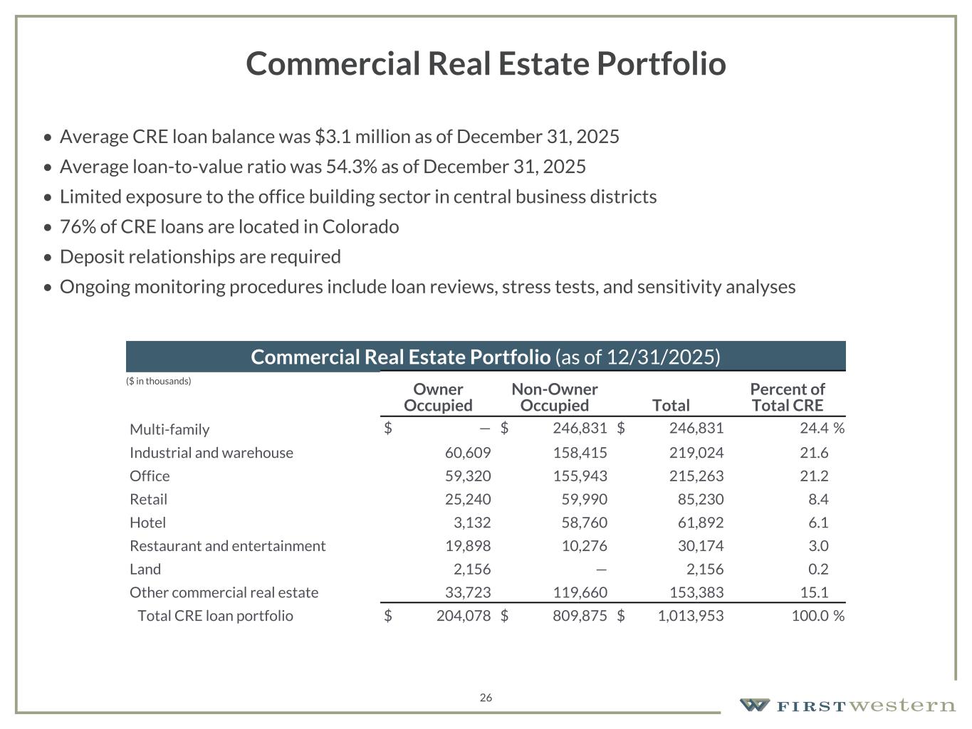 157 180 196 164 166 168 62 94 111 154 161 132 122 125 129 76 78 86 255 255 255 Chart color Table color Special Headlines Slide Headlines / Text on light background Primary Colors Secondary Colors Primary Background / Call Out Boxes / Text on dark background Chart color Table Color Tertiary Colors Chart color Table Color Chart Color Chart Color Approved Fonts AaBbCc 123 Lora (bold) Slide Headlines / Special Headlines AaBbCc 123 Lato(regular, bold, italics) Body Copy / Subheadings / Small Text Descriptions 26 Commercial Real Estate Portfolio • Average CRE loan balance was $3.1 million as of December 31, 2025 • Average loan-to-value ratio was 54.3% as of December 31, 2025 • Limited exposure to the office building sector in central business districts • 76% of CRE loans are located in Colorado • Deposit relationships are required • Ongoing monitoring procedures include loan reviews, stress tests, and sensitivity analyses Commercial Real Estate Portfolio (as of 12/31/2025) Owner Occupied Non-Owner Occupied Total Percent of Total CRE Multi-family $ — $ 246,831 $ 246,831 24.4 % Industrial and warehouse 60,609 158,415 219,024 21.6 Office 59,320 155,943 215,263 21.2 Retail 25,240 59,990 85,230 8.4 Hotel 3,132 58,760 61,892 6.1 Restaurant and entertainment 19,898 10,276 30,174 3.0 Land 2,156 — 2,156 0.2 Other commercial real estate 33,723 119,660 153,383 15.1 Total CRE loan portfolio $ 204,078 $ 809,875 $ 1,013,953 100.0 % ($ in thousands)