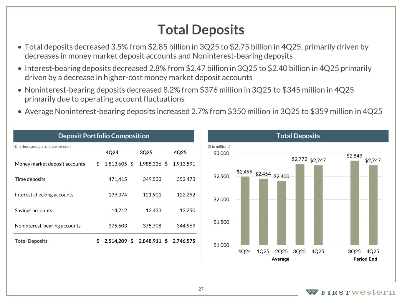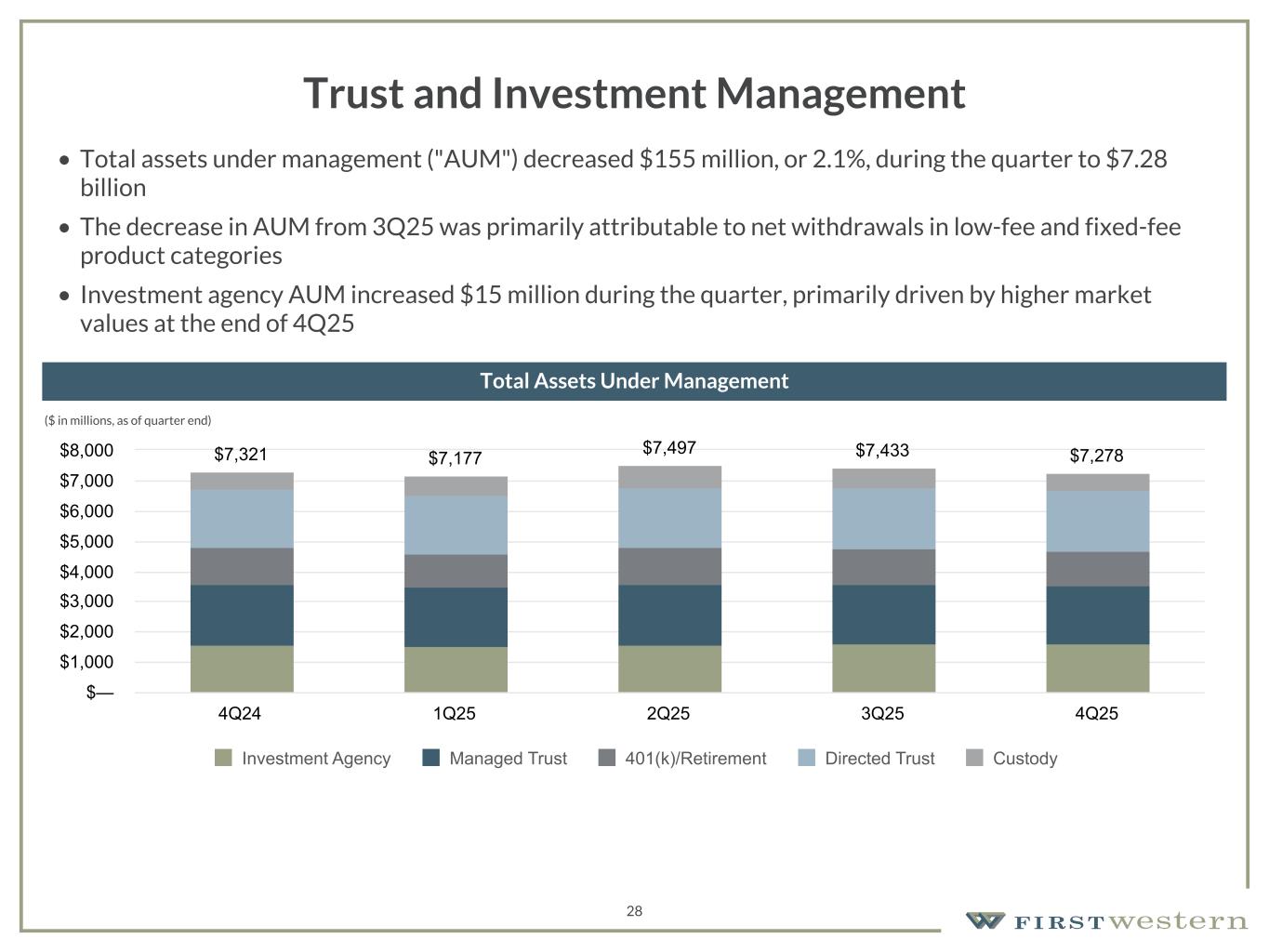 157 180 196 164 166 168 62 94 111 154 161 132 122 125 129 76 78 86 255 255 255 Chart color Table color Special Headlines Slide Headlines / Text on light background Primary Colors Secondary Colors Primary Background / Call Out Boxes / Text on dark background Chart color Table Color Tertiary Colors Chart color Table Color Chart Color Chart Color Approved Fonts AaBbCc 123 Lora (bold) Slide Headlines / Special Headlines AaBbCc 123 Lato(regular, bold, italics) Body Copy / Subheadings / Small Text Descriptions 27 Total Deposits • Total deposits decreased 3.5% from $2.85 billion in 3Q25 to $2.75 billion in 4Q25, primarily driven by decreases in money market deposit accounts and Noninterest-bearing deposits • Interest-bearing deposits decreased 2.8% from $2.47 billion in 3Q25 to $2.40 billion in 4Q25 primarily driven by a decrease in higher-cost money market deposit accounts • Noninterest-bearing deposits decreased 8.2% from $376 million in 3Q25 to $345 million in 4Q25 primarily due to operating account fluctuations • Average Noninterest-bearing deposits increased 2.7% from $350 million in 3Q25 to $359 million in 4Q25 4Q24 3Q25 4Q25 Money market deposit accounts $ 1,513,605 $ 1,988,336 $ 1,913,591 Time deposits 471,415 349,533 352,473 Interest checking accounts 139,374 121,901 122,292 Savings accounts 14,212 13,433 13,250 Noninterest-bearing accounts 375,603 375,708 344,969 Total Deposits $ 2,514,209 $ 2,848,911 $ 2,746,575 Deposit Portfolio Composition Total Deposits $2,499 $2,454 $2,400 $2,772 $2,747 $2,849 $2,747 4Q24 1Q25 2Q25 3Q25 4Q25 3Q25 4Q25 $1,000 $1,500 $2,000 $2,500 $3,000 Average Period End ($ in millions)($ in thousands, as of quarter end)