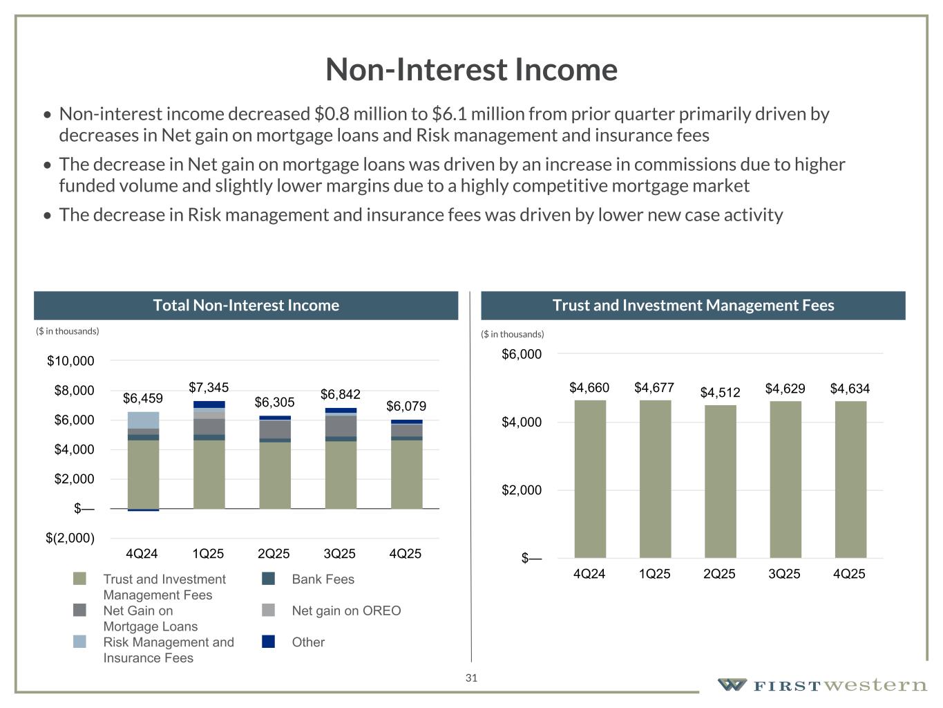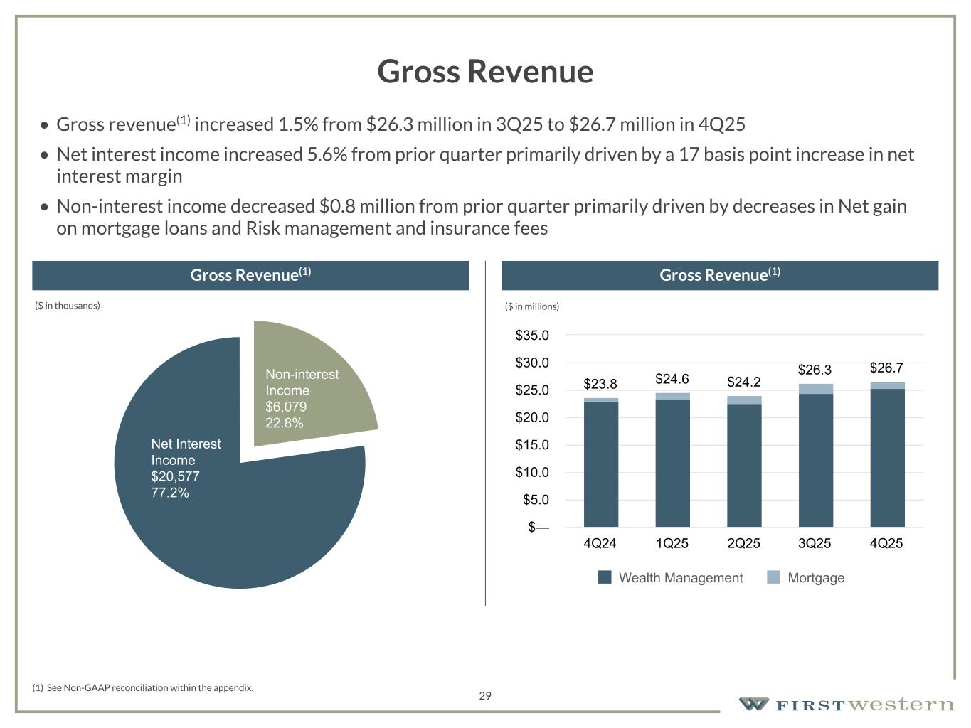 157 180 196 164 166 168 62 94 111 154 161 132 122 125 129 76 78 86 255 255 255 Chart color Table color Special Headlines Slide Headlines / Text on light background Primary Colors Secondary Colors Primary Background / Call Out Boxes / Text on dark background Chart color Table Color Tertiary Colors Chart color Table Color Chart Color Chart Color Approved Fonts AaBbCc 123 Lora (bold) Slide Headlines / Special Headlines AaBbCc 123 Lato(regular, bold, italics) Body Copy / Subheadings / Small Text Descriptions (1) See Non-GAAP reconciliation within the appendix. Gross Revenue Gross Revenue(1) Gross Revenue(1) 29 $23.8 $24.6 $24.2 $26.3 $26.7 Wealth Management Mortgage 4Q24 1Q25 2Q25 3Q25 4Q25 $— $5.0 $10.0 $15.0 $20.0 $25.0 $30.0 $35.0 • Gross revenue(1) increased 1.5% from $26.3 million in 3Q25 to $26.7 million in 4Q25 • Net interest income increased 5.6% from prior quarter primarily driven by a 17 basis point increase in net interest margin • Non-interest income decreased $0.8 million from prior quarter primarily driven by decreases in Net gain on mortgage loans and Risk management and insurance fees Non-interest Income $6,079 22.8% Net Interest Income $20,577 77.2% ($ in thousands) ($ in millions)