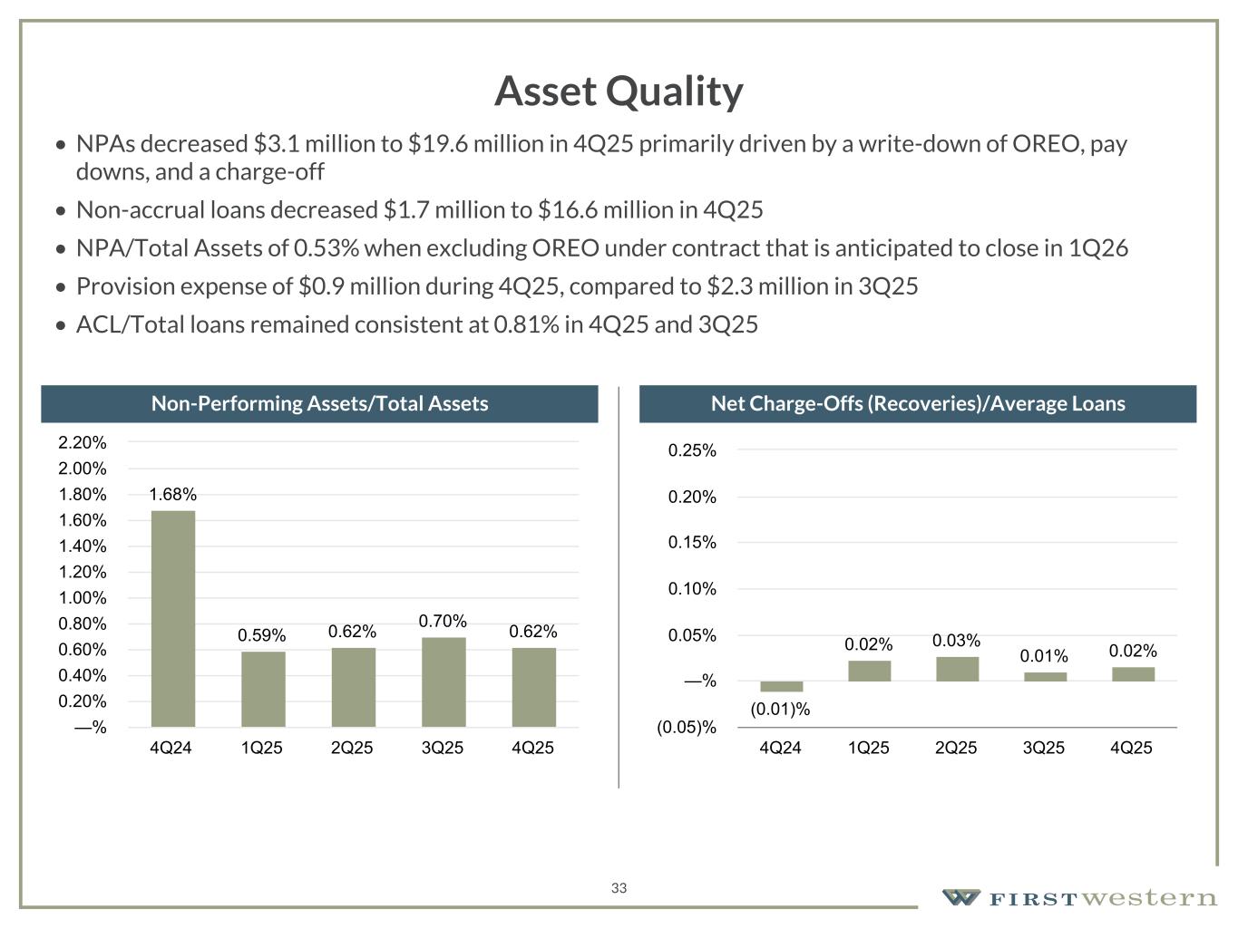 157 180 196 164 166 168 62 94 111 154 161 132 122 125 129 76 78 86 255 255 255 Chart color Table color Special Headlines Slide Headlines / Text on light background Primary Colors Secondary Colors Primary Background / Call Out Boxes / Text on dark background Chart color Table Color Tertiary Colors Chart color Table Color Chart Color Chart Color Approved Fonts AaBbCc 123 Lora (bold) Slide Headlines / Special Headlines AaBbCc 123 Lato(regular, bold, italics) Body Copy / Subheadings / Small Text Descriptions 32 Non-Interest Expense and Efficiency Ratio • Non-interest expense increased to $21.3 million from $20.1 million in the third quarter of 2025, primarily driven by a $1.4 million OREO write-down and an increase in Professional services, partially offset by decreases in Occupancy and equipment and Salaries and employee benefits • Non-interest expense excluding the OREO write-down decreased to $20.0 million from $20.1 million in the third quarter • The efficiency ratio improved from 76.38% as of 3Q25 and 80.74% as of 4Q24 to 74.88% as of 4Q25 • Efficiency ratio improvement for the fifth consecutive quarter (1) See Non-GAAP reconciliation within the appendix. Adjusted Non-Interest Expense(1) Operating Efficiency Ratio(1) (1) (1) (1) $19,205 $19,441 $19,046 $20,066 $19,996 4Q24 1Q25 2Q25 3Q25 4Q25 $— $5,000 $10,000 $15,000 $20,000 $25,000 80.74% 79.16% 78.83% 76.38% 74.88% 4Q24 1Q25 2Q25 3Q25 4Q25 —% 20.00% 40.00% 60.00% 80.00% 100.00% ($ in thousands)