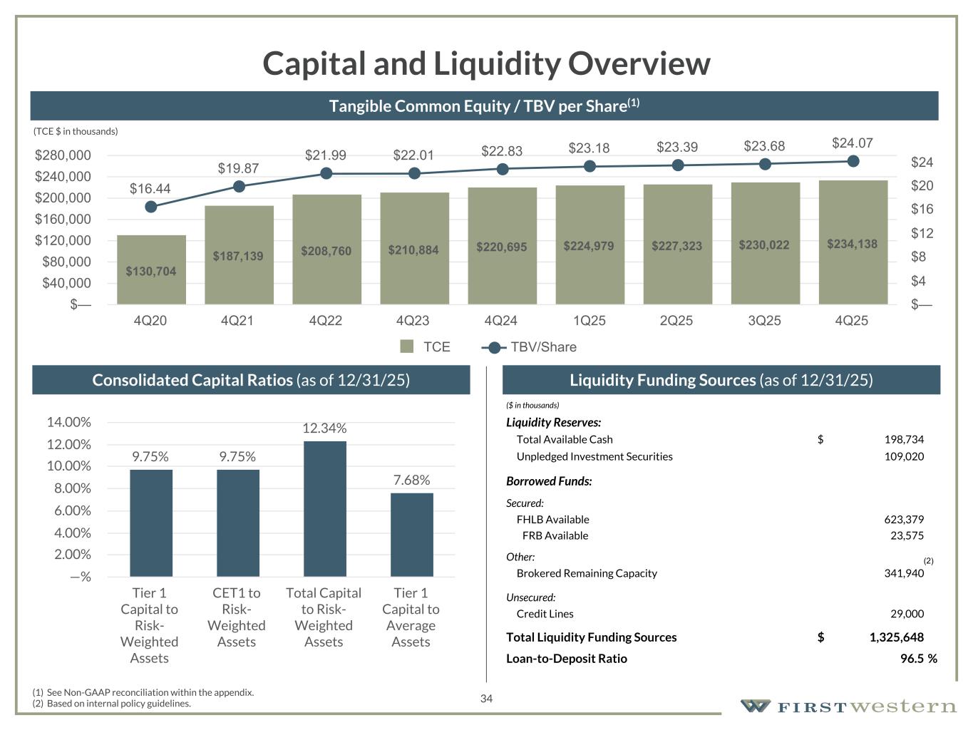 157 180 196 164 166 168 62 94 111 154 161 132 122 125 129 76 78 86 255 255 255 Chart color Table color Special Headlines Slide Headlines / Text on light background Primary Colors Secondary Colors Primary Background / Call Out Boxes / Text on dark background Chart color Table Color Tertiary Colors Chart color Table Color Chart Color Chart Color Approved Fonts AaBbCc 123 Lora (bold) Slide Headlines / Special Headlines AaBbCc 123 Lato(regular, bold, italics) Body Copy / Subheadings / Small Text Descriptions 33 Asset Quality • NPAs decreased $3.1 million to $19.6 million in 4Q25 primarily driven by a write-down of OREO, pay downs, and a charge-off • Non-accrual loans decreased $1.7 million to $16.6 million in 4Q25 • NPA/Total Assets of 0.53% when excluding OREO under contract that is anticipated to close in 1Q26 • Provision expense of $0.9 million during 4Q25, compared to $2.3 million in 3Q25 • ACL/Total loans remained consistent at 0.81% in 4Q25 and 3Q25 Non-Performing Assets/Total Assets Net Charge-Offs (Recoveries)/Average Loans 1.68% 0.59% 0.62% 0.70% 0.62% 4Q24 1Q25 2Q25 3Q25 4Q25 —% 0.20% 0.40% 0.60% 0.80% 1.00% 1.20% 1.40% 1.60% 1.80% 2.00% 2.20% (0.01)% 0.02% 0.03% 0.01% 0.02% 4Q24 1Q25 2Q25 3Q25 4Q25 (0.05)% —% 0.05% 0.10% 0.15% 0.20% 0.25%