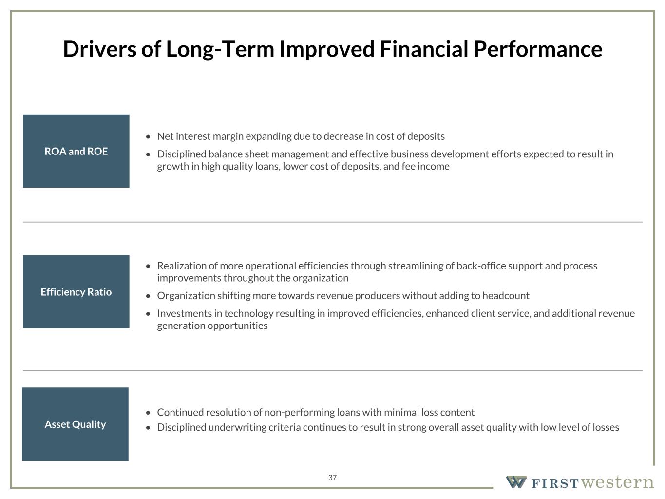 157 180 196 164 166 168 62 94 111 154 161 132 122 125 129 76 78 86 255 255 255 Chart color Table color Special Headlines Slide Headlines / Text on light background Primary Colors Secondary Colors Primary Background / Call Out Boxes / Text on dark background Chart color Table Color Tertiary Colors Chart color Table Color Chart Color Chart Color Approved Fonts AaBbCc 123 Lora (bold) Slide Headlines / Special Headlines AaBbCc 123 Lato (regular, bold, italics) Body Copy / Subheadings / Small Text Descriptions 36 Near Term Outlook • First Western's markets continue to perform well and the strength of our balance sheet and franchise provides opportunities to capitalize on market disruption and challenges being faced by competing banks to add new clients and banking talent • New market president added in Arizona, which represents good growth opportunities • Loan pipeline remains strong and should continue to result in solid loan growth in 2026 • Positive trends expected to continue ◦ Solid loan and deposit growth ◦ Continued expansion in net interest margin ◦ More robust business development activities in Wealth Management business ◦ Higher level of mortgage production resulting from addition of MLOs ◦ More operating leverage resulting from disciplined expense control ◦ No meaningful deterioration expected in asset quality given the trends we are seeing in the portfolio and our clients continuing to perform well • Positive trends in key areas expected to continue, which should result in steady improvement in financial performance and further value being created for shareholders