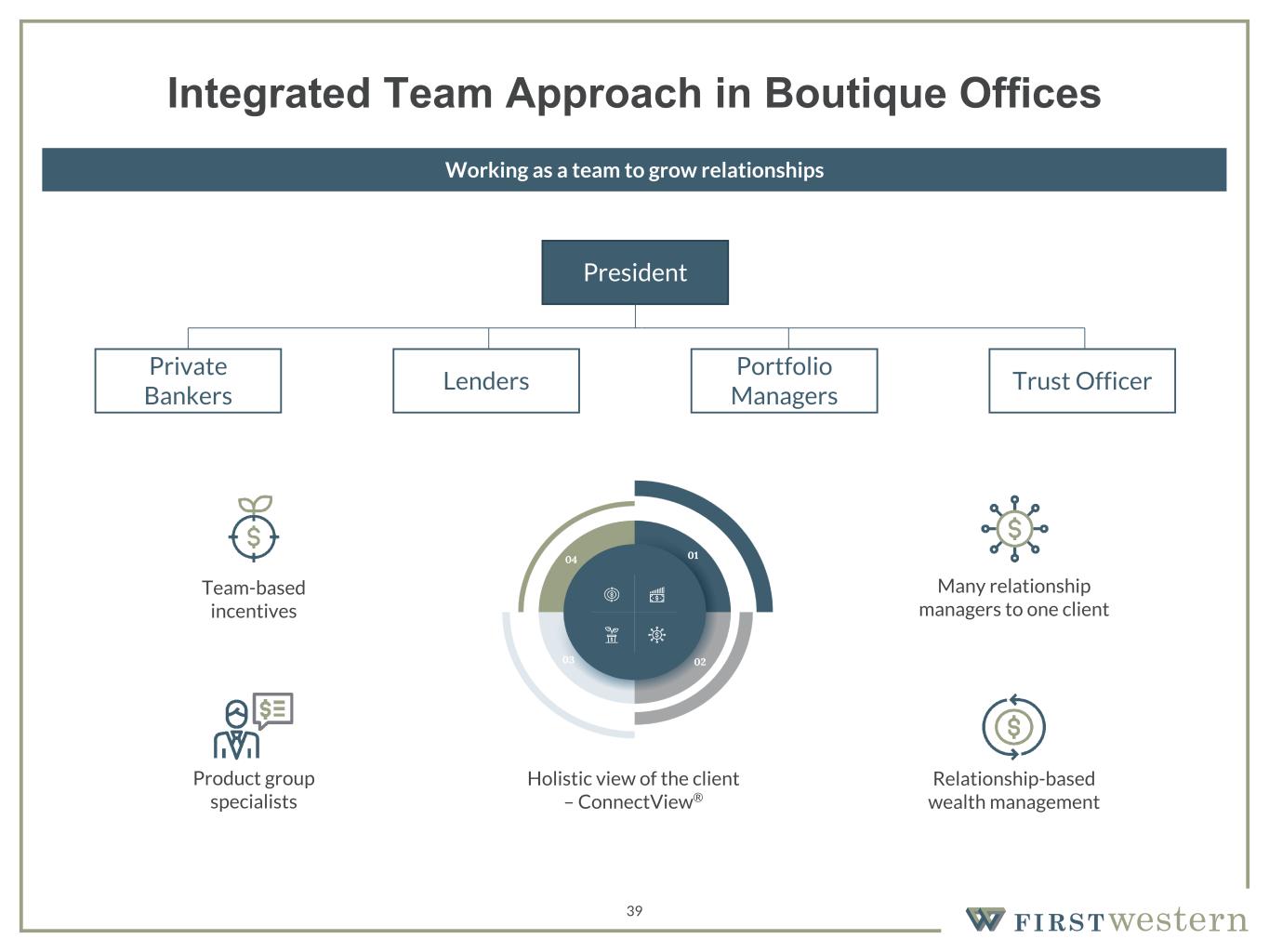 157 180 196 164 166 168 62 94 111 154 161 132 122 125 129 76 78 86 255 255 255 Chart color Table color Special Headlines Slide Headlines / Text on light background Primary Colors Secondary Colors Primary Background / Call Out Boxes / Text on dark background Chart color Table Color Tertiary Colors Chart color Table Color Chart Color Chart Color Approved Fonts AaBbCc 123 Lora (bold) Slide Headlines / Special Headlines AaBbCc 123 Lato (regular, bold, italics) Body Copy / Subheadings / Small Text Descriptions 39 President Private Bankers Lenders Portfolio Managers Trust Officer Team-based incentives Relationship-based wealth management Many relationship managers to one client Product group specialists Holistic view of the client – ConnectView® Integrated Team Approach in Boutique Offices Working as a team to grow relationships