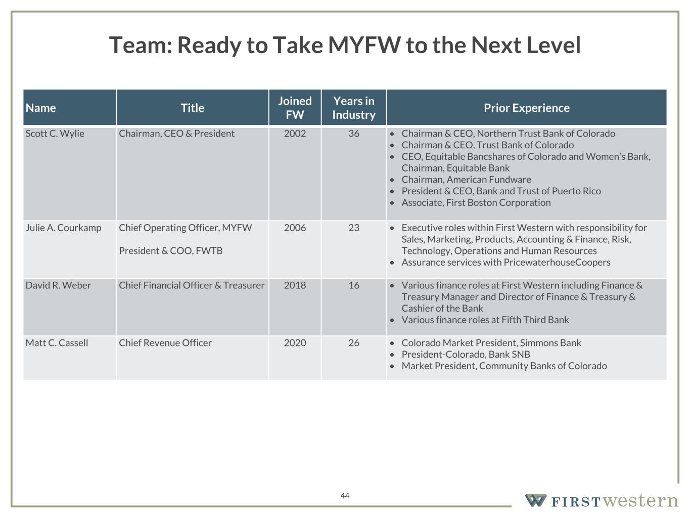 157 180 196 164 166 168 62 94 111 154 161 132 122 125 129 76 78 86 255 255 255 Chart color Table color Special Headlines Slide Headlines / Text on light background Primary Colors Secondary Colors Primary Background / Call Out Boxes / Text on dark background Chart color Table Color Tertiary Colors Chart color Table Color Chart Color Chart Color Approved Fonts AaBbCc 123 Lora (bold) Slide Headlines / Special Headlines AaBbCc 123 Lato (regular, bold, italics) Body Copy / Subheadings / Small Text Descriptions Name Title Joined FW Years in Industry Prior Experience Scott C. Wylie Chairman, CEO & President 2002 36 • Chairman & CEO, Northern Trust Bank of Colorado • Chairman & CEO, Trust Bank of Colorado • CEO, Equitable Bancshares of Colorado and Women’s Bank, Chairman, Equitable Bank • Chairman, American Fundware • President & CEO, Bank and Trust of Puerto Rico • Associate, First Boston Corporation Julie A. Courkamp Chief Operating Officer, MYFW President & COO, FWTB 2006 23 • Executive roles within First Western with responsibility for Sales, Marketing, Products, Accounting & Finance, Risk, Technology, Operations and Human Resources • Assurance services with PricewaterhouseCoopers David R. Weber Chief Financial Officer & Treasurer 2018 16 • Various finance roles at First Western including Finance & Treasury Manager and Director of Finance & Treasury & Cashier of the Bank • Various finance roles at Fifth Third Bank Matt C. Cassell Chief Revenue Officer 2020 26 • Colorado Market President, Simmons Bank • President-Colorado, Bank SNB • Market President, Community Banks of Colorado 44 Team: Ready to Take MYFW to the Next Level
