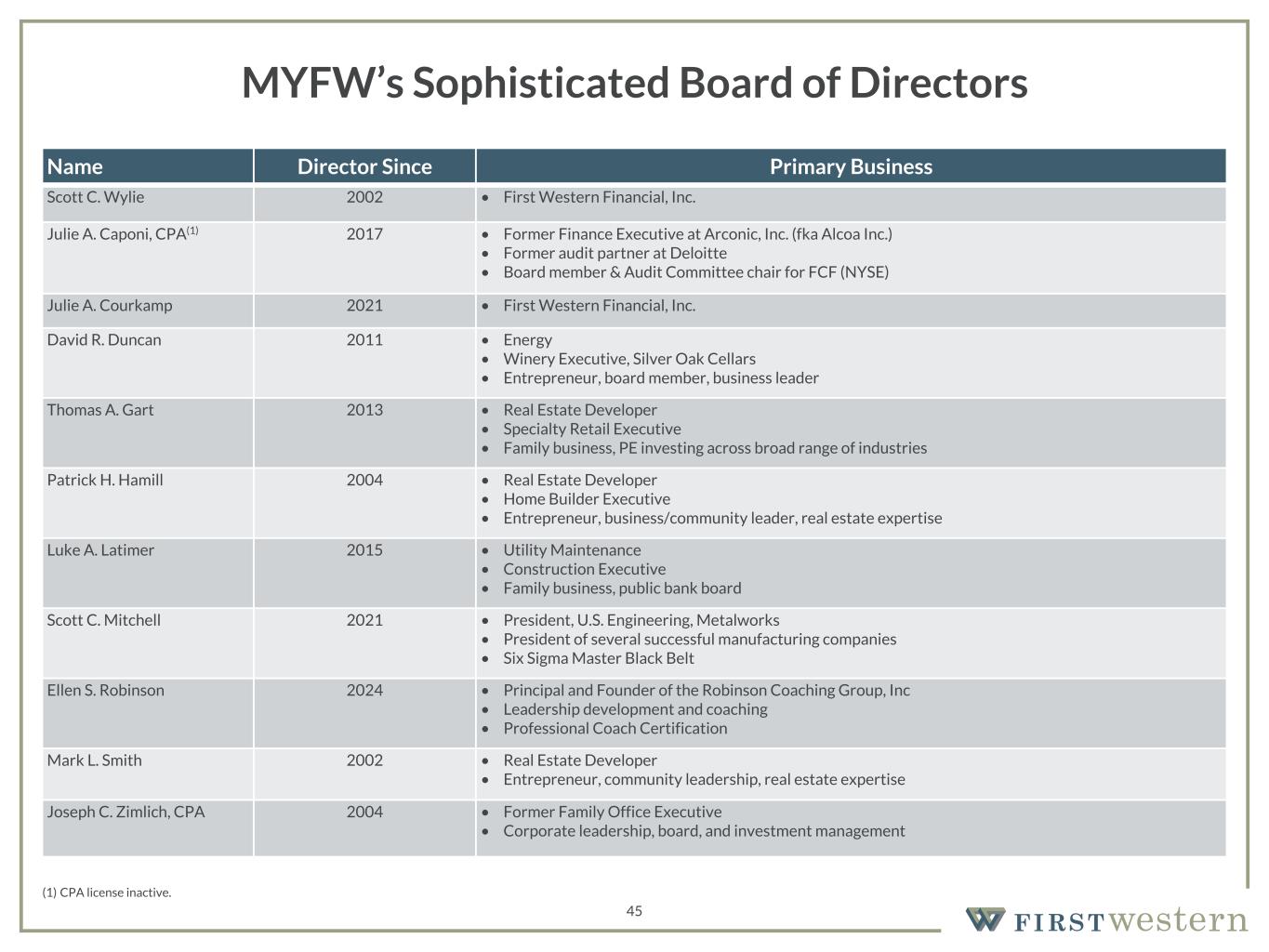157 180 196 164 166 168 62 94 111 154 161 132 122 125 129 76 78 86 255 255 255 Chart color Table color Special Headlines Slide Headlines / Text on light background Primary Colors Secondary Colors Primary Background / Call Out Boxes / Text on dark background Chart color Table Color Tertiary Colors Chart color Table Color Chart Color Chart Color Approved Fonts AaBbCc 123 Lora (bold) Slide Headlines / Special Headlines AaBbCc 123 Lato (regular, bold, italics) Body Copy / Subheadings / Small Text Descriptions Name Director Since Primary Business Scott C. Wylie 2002 • First Western Financial, Inc. Julie A. Caponi, CPA(1) 2017 • Former Finance Executive at Arconic, Inc. (fka Alcoa Inc.) • Former audit partner at Deloitte • Board member & Audit Committee chair for FCF (NYSE) Julie A. Courkamp 2021 • First Western Financial, Inc. David R. Duncan 2011 • Energy • Winery Executive, Silver Oak Cellars • Entrepreneur, board member, business leader Thomas A. Gart 2013 • Real Estate Developer • Specialty Retail Executive • Family business, PE investing across broad range of industries Patrick H. Hamill 2004 • Real Estate Developer • Home Builder Executive • Entrepreneur, business/community leader, real estate expertise Luke A. Latimer 2015 • Utility Maintenance • Construction Executive • Family business, public bank board Scott C. Mitchell 2021 • President, U.S. Engineering, Metalworks • President of several successful manufacturing companies • Six Sigma Master Black Belt Ellen S. Robinson 2024 • Principal and Founder of the Robinson Coaching Group, Inc • Leadership development and coaching • Professional Coach Certification Mark L. Smith 2002 • Real Estate Developer • Entrepreneur, community leadership, real estate expertise Joseph C. Zimlich, CPA 2004 • Former Family Office Executive • Corporate leadership, board, and investment management 45 MYFW’s Sophisticated Board of Directors (1) CPA license inactive.