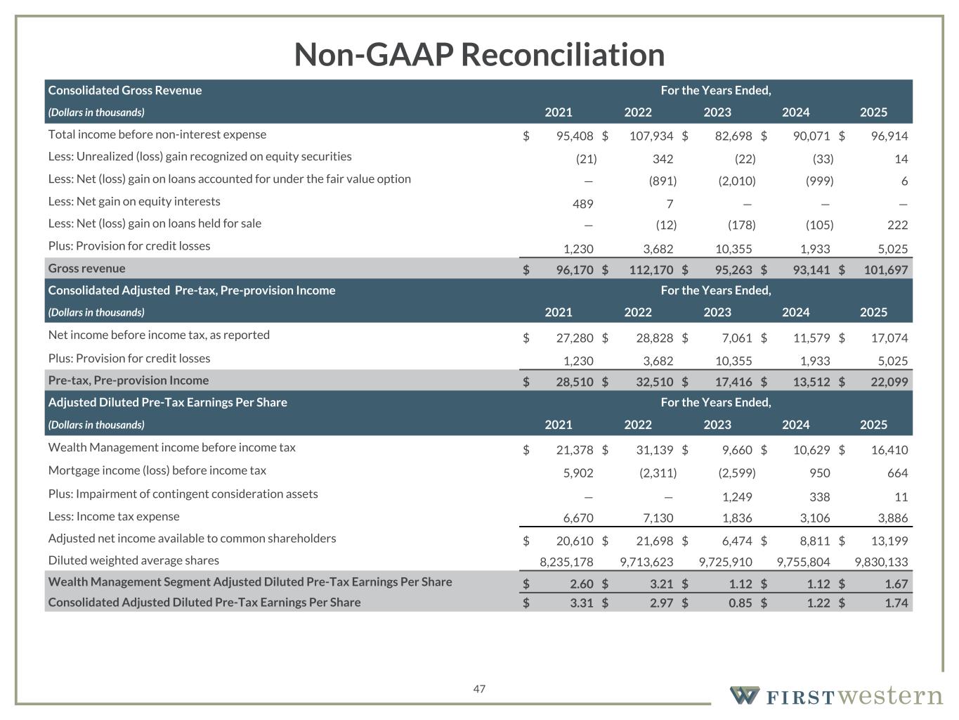157 180 196 164 166 168 62 94 111 154 161 132 122 125 129 76 78 86 255 255 255 Chart color Table color Special Headlines Slide Headlines / Text on light background Primary Colors Secondary Colors Primary Background / Call Out Boxes / Text on dark background Chart color Table Color Tertiary Colors Chart color Table Color Chart Color Chart Color Approved Fonts AaBbCc 123 Lora (bold) Slide Headlines / Special Headlines AaBbCc 123 Lato (regular, bold, italics) Body Copy / Subheadings / Small Text Descriptions 47 Non-GAAP Reconciliation Consolidated Gross Revenue For the Years Ended, (Dollars in thousands) 2021 2022 2023 2024 2025 Total income before non-interest expense $ 95,408 $ 107,934 $ 82,698 $ 90,071 $ 96,914 Less: Unrealized (loss) gain recognized on equity securities (21) 342 (22) (33) 14 Less: Net (loss) gain on loans accounted for under the fair value option — (891) (2,010) (999) 6 Less: Net gain on equity interests 489 7 — — — Less: Net (loss) gain on loans held for sale — (12) (178) (105) 222 Plus: Provision for credit losses 1,230 3,682 10,355 1,933 5,025 Gross revenue $ 96,170 $ 112,170 $ 95,263 $ 93,141 $ 101,697 Consolidated Adjusted Pre-tax, Pre-provision Income For the Years Ended, (Dollars in thousands) 2021 2022 2023 2024 2025 Net income before income tax, as reported $ 27,280 $ 28,828 $ 7,061 $ 11,579 $ 17,074 Plus: Provision for credit losses 1,230 3,682 10,355 1,933 5,025 Pre-tax, Pre-provision Income $ 28,510 $ 32,510 $ 17,416 $ 13,512 $ 22,099 Adjusted Diluted Pre-Tax Earnings Per Share For the Years Ended, (Dollars in thousands) 2021 2022 2023 2024 2025 Wealth Management income before income tax $ 21,378 $ 31,139 $ 9,660 $ 10,629 $ 16,410 Mortgage income (loss) before income tax 5,902 (2,311) (2,599) 950 664 Plus: Impairment of contingent consideration assets — — 1,249 338 11 Less: Income tax expense 6,670 7,130 1,836 3,106 3,886 Adjusted net income available to common shareholders $ 20,610 $ 21,698 $ 6,474 $ 8,811 $ 13,199 Diluted weighted average shares 8,235,178 9,713,623 9,725,910 9,755,804 9,830,133 Wealth Management Segment Adjusted Diluted Pre-Tax Earnings Per Share $ 2.60 $ 3.21 $ 1.12 $ 1.12 $ 1.67 Consolidated Adjusted Diluted Pre-Tax Earnings Per Share $ 3.31 $ 2.97 $ 0.85 $ 1.22 $ 1.74