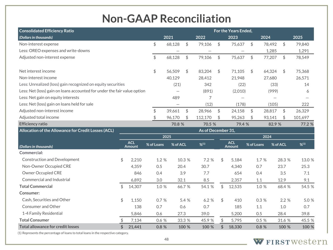 157 180 196 164 166 168 62 94 111 154 161 132 122 125 129 76 78 86 255 255 255 Chart color Table color Special Headlines Slide Headlines / Text on light background Primary Colors Secondary Colors Primary Background / Call Out Boxes / Text on dark background Chart color Table Color Tertiary Colors Chart color Table Color Chart Color Chart Color Approved Fonts AaBbCc 123 Lora (bold) Slide Headlines / Special Headlines AaBbCc 123 Lato (regular, bold, italics) Body Copy / Subheadings / Small Text Descriptions 48 Non-GAAP Reconciliation (1) Represents the percentage of loans to total loans in the respective category. Consolidated Efficiency Ratio For the Years Ended, (Dollars in thousands) 2021 2022 2023 2024 2025 Non-interest expense $ 68,128 $ 79,106 $ 75,637 $ 78,492 $ 79,840 Less: OREO expenses and write-downs — — — 1,285 1,291 Adjusted non-interest expense $ 68,128 $ 79,106 $ 75,637 $ 77,207 $ 78,549 Net interest income $ 56,509 $ 83,204 $ 71,105 $ 64,324 $ 75,368 Non-interest income 40,129 28,412 21,948 27,680 26,571 Less: Unrealized (loss) gain recognized on equity securities (21) 342 (22) (33) 14 Less: Net (loss) gain on loans accounted for under the fair value option — (891) (2,010) (999) 6 Less: Net gain on equity interests 489 7 — — — Less: Net (loss) gain on loans held for sale — (12) (178) (105) 222 Adjusted non-interest income $ 39,661 $ 28,966 $ 24,158 $ 28,817 $ 26,329 Adjusted total income $ 96,170 $ 112,170 $ 95,263 $ 93,141 $ 101,697 Efficiency ratio 70.8 % 70.5 % 79.4 % 82.9 % 77.2 % Allocation of the Allowance for Credit Losses (ACL) As of December 31, 2025 2024 (Dollars in thousands) ACL Amount % of Loans % of ACL %(1) ACL Amount % of Loans % of ACL %(1) Commercial: Construction and Development $ 2,210 1.2 % 10.3 % 7.2 % $ 5,184 1.7 % 28.3 % 13.0 % Non-Owner Occupied CRE 4,359 0.5 20.4 30.7 4,340 0.7 23.7 25.3 Owner Occupied CRE 846 0.4 3.9 7.7 654 0.4 3.5 7.1 Commercial and Industrial 6,892 3.0 32.1 8.5 2,357 1.1 12.9 9.1 Total Commercial $ 14,307 1.0 % 66.7 % 54.1 % $ 12,535 1.0 % 68.4 % 54.5 % Consumer: Cash, Securities and Other $ 1,150 0.7 % 5.4 % 6.2 % $ 410 0.3 % 2.2 % 5.0 % Consumer and Other 138 0.7 0.6 0.7 185 1.1 1.0 0.7 1-4 Family Residential 5,846 0.6 27.3 39.0 5,200 0.5 28.4 39.8 Total Consumer $ 7,134 0.6 % 33.3 % 45.9 % $ 5,795 0.5 % 31.6 % 45.5 % Total allowance for credit losses $ 21,441 0.8 % 100 % 100 % $ 18,330 0.8 % 100 % 100 %