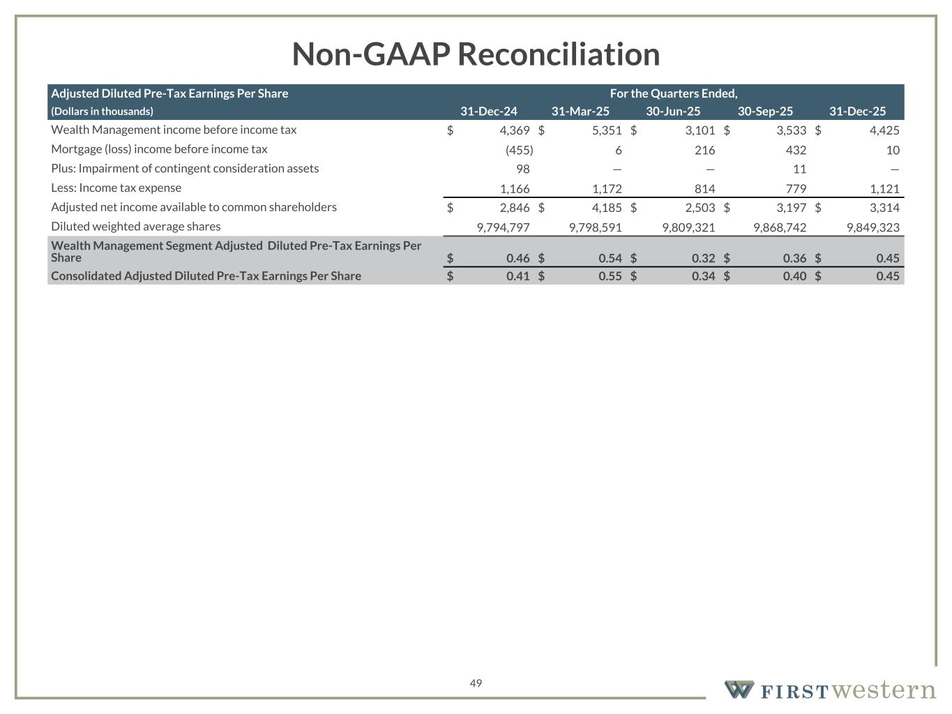 157 180 196 164 166 168 62 94 111 154 161 132 122 125 129 76 78 86 255 255 255 Chart color Table color Special Headlines Slide Headlines / Text on light background Primary Colors Secondary Colors Primary Background / Call Out Boxes / Text on dark background Chart color Table Color Tertiary Colors Chart color Table Color Chart Color Chart Color Approved Fonts AaBbCc 123 Lora (bold) Slide Headlines / Special Headlines AaBbCc 123 Lato(regular, bold, italics) Body Copy / Subheadings / Small Text Descriptions 49 Non-GAAP Reconciliation Adjusted Diluted Pre-Tax Earnings Per Share For the Quarters Ended, (Dollars in thousands) 31-Dec-24 31-Mar-25 30-Jun-25 30-Sep-25 31-Dec-25 Wealth Management income before income tax $ 4,369 $ 5,351 $ 3,101 $ 3,533 $ 4,425 Mortgage (loss) income before income tax (455) 6 216 432 10 Plus: Impairment of contingent consideration assets 98 — — 11 — Less: Income tax expense 1,166 1,172 814 779 1,121 Adjusted net income available to common shareholders $ 2,846 $ 4,185 $ 2,503 $ 3,197 $ 3,314 Diluted weighted average shares 9,794,797 9,798,591 9,809,321 9,868,742 9,849,323 Wealth Management Segment Adjusted Diluted Pre-Tax Earnings Per Share $ 0.46 $ 0.54 $ 0.32 $ 0.36 $ 0.45 Consolidated Adjusted Diluted Pre-Tax Earnings Per Share $ 0.41 $ 0.55 $ 0.34 $ 0.40 $ 0.45