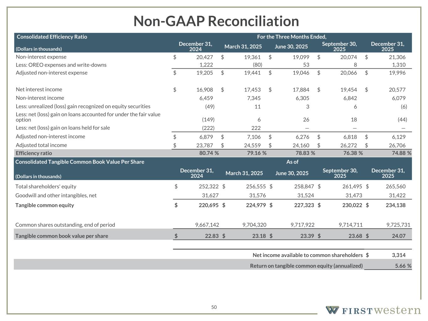 157 180 196 164 166 168 62 94 111 154 161 132 122 125 129 76 78 86 255 255 255 Chart color Table color Special Headlines Slide Headlines / Text on light background Primary Colors Secondary Colors Primary Background / Call Out Boxes / Text on dark background Chart color Table Color Tertiary Colors Chart color Table Color Chart Color Chart Color Approved Fonts AaBbCc 123 Lora (bold) Slide Headlines / Special Headlines AaBbCc 123 Lato(regular, bold, italics) Body Copy / Subheadings / Small Text Descriptions 50 Non-GAAP Reconciliation Consolidated Tangible Common Book Value Per Share As of (Dollars in thousands) December 31, 2024 March 31, 2025 June 30, 2025 September 30, 2025 December 31, 2025 Total shareholders' equity $ 252,322 $ 256,555 $ 258,847 $ 261,495 $ 265,560 Goodwill and other intangibles, net 31,627 31,576 31,524 31,473 31,422 Tangible common equity $ 220,695 $ 224,979 $ 227,323 $ 230,022 $ 234,138 Common shares outstanding, end of period 9,667,142 9,704,320 9,717,922 9,714,711 9,725,731 Tangible common book value per share $ 22.83 $ 23.18 $ 23.39 $ 23.68 $ 24.07 Net income available to common shareholders $ 3,314 Return on tangible common equity (annualized) 5.66 %  Consolidated Efficiency Ratio For the Three Months Ended, (Dollars in thousands) December 31, 2024 March 31, 2025 June 30, 2025 September 30, 2025 December 31, 2025 Non-interest expense $ 20,427 $ 19,361 $ 19,099 $ 20,074 $ 21,306 Less: OREO expenses and write-downs 1,222 (80) 53 8 1,310 Adjusted non-interest expense $ 19,205 $ 19,441 $ 19,046 $ 20,066 $ 19,996 Net interest income $ 16,908 $ 17,453 $ 17,884 $ 19,454 $ 20,577 Non-interest income 6,459 7,345 6,305 6,842 6,079 Less: unrealized (loss) gain recognized on equity securities (49) 11 3 6 (6) Less: net (loss) gain on loans accounted for under the fair value option (149) 6 26 18 (44) Less: net (loss) gain on loans held for sale (222) 222 — — — Adjusted non-interest income $ 6,879 $ 7,106 $ 6,276 $ 6,818 $ 6,129 Adjusted total income $ 23,787 $ 24,559 $ 24,160 $ 26,272 $ 26,706 Efficiency ratio 80.74 % 79.16 % 78.83 % 76.38 % 74.88 %