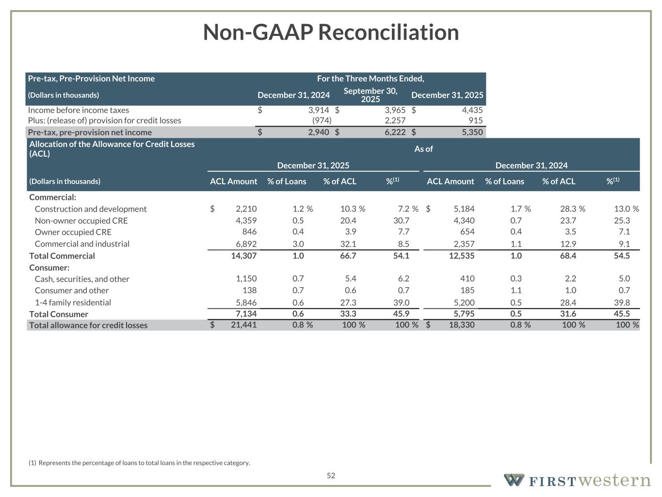 157 180 196 164 166 168 62 94 111 154 161 132 122 125 129 76 78 86 255 255 255 Chart color Table color Special Headlines Slide Headlines / Text on light background Primary Colors Secondary Colors Primary Background / Call Out Boxes / Text on dark background Chart color Table Color Tertiary Colors Chart color Table Color Chart Color Chart Color Approved Fonts AaBbCc 123 Lora (bold) Slide Headlines / Special Headlines AaBbCc 123 Lato(regular, bold, italics) Body Copy / Subheadings / Small Text Descriptions 52 Non-GAAP Reconciliation Pre-tax, Pre-Provision Net Income For the Three Months Ended, (Dollars in thousands) December 31, 2024 September 30, 2025 December 31, 2025 Income before income taxes $ 3,914 $ 3,965 $ 4,435 Plus: (release of) provision for credit losses (974) 2,257 915 Pre-tax, pre-provision net income $ 2,940 $ 6,222 $ 5,350 Allocation of the Allowance for Credit Losses (ACL) As of December 31, 2025 December 31, 2024 (Dollars in thousands) ACL Amount % of Loans % of ACL %(1) ACL Amount % of Loans % of ACL %(1) Commercial: Construction and development $ 2,210 1.2 % 10.3 % 7.2 % $ 5,184 1.7 % 28.3 % 13.0 % Non-owner occupied CRE 4,359 0.5 20.4 30.7 4,340 0.7 23.7 25.3 Owner occupied CRE 846 0.4 3.9 7.7 654 0.4 3.5 7.1 Commercial and industrial 6,892 3.0 32.1 8.5 2,357 1.1 12.9 9.1 Total Commercial 14,307 1.0 66.7 54.1 12,535 1.0 68.4 54.5 Consumer: Cash, securities, and other 1,150 0.7 5.4 6.2 410 0.3 2.2 5.0 Consumer and other 138 0.7 0.6 0.7 185 1.1 1.0 0.7 1-4 family residential 5,846 0.6 27.3 39.0 5,200 0.5 28.4 39.8 Total Consumer 7,134 0.6 33.3 45.9 5,795 0.5 31.6 45.5 Total allowance for credit losses $ 21,441 0.8 % 100 % 100 % $ 18,330 0.8 % 100 % 100 % (1) Represents the percentage of loans to total loans in the respective category.