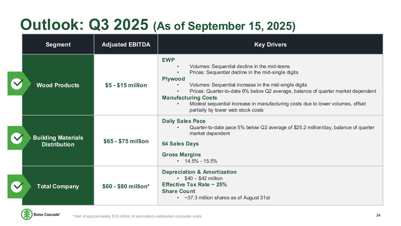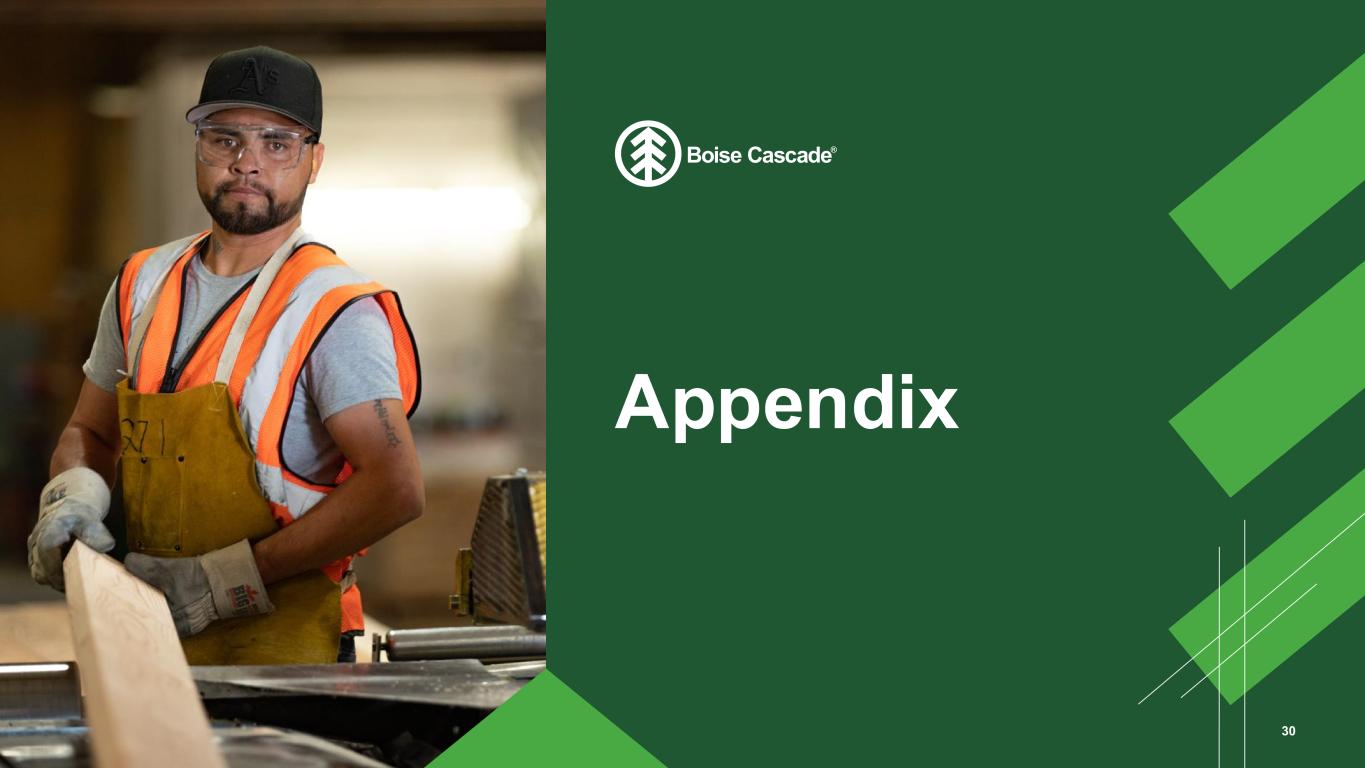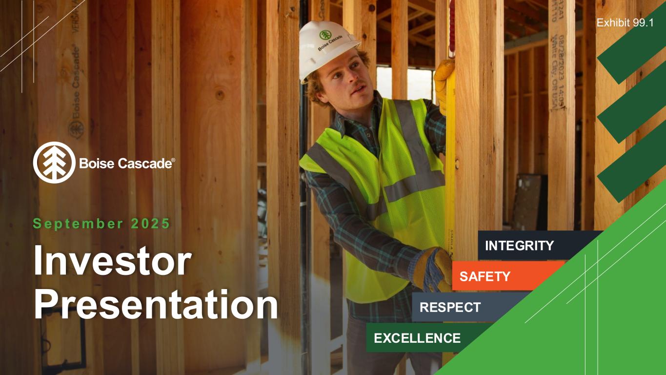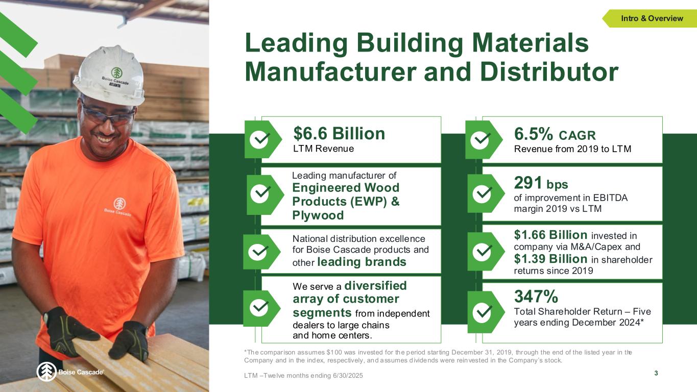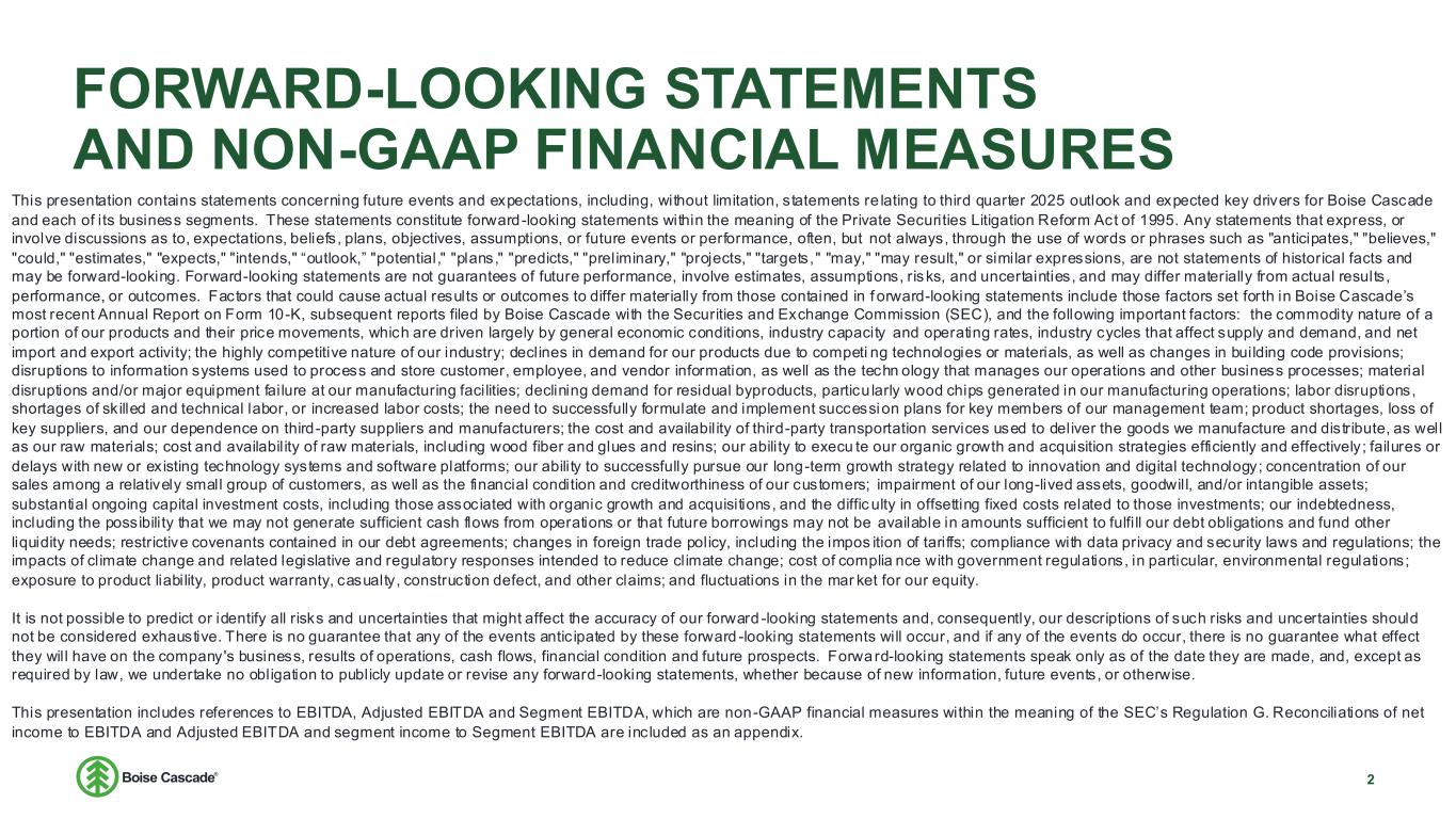 FORWARD-LOOKING STATEMENTS AND NON-GAAP FINANCIAL MEASURES 2 This presentation contains statements concerning future events and expectations, including, without limitation, statements re lating to third quarter 2025 outlook and expected key drivers for Boise Cascade and each of its business segments. These statements constitute forward-looking statements within the meaning of the Private Securities Litigation Reform Act of 1995. Any statements that express, or involve discussions as to, expectations, beliefs, plans, objectives, assumptions, or future events or performance, often, but not always, through the use of words or phrases such as "anticipates," "believes," "could," "estimates," "expects," "intends," “outlook,” "potential," "plans," "predicts," "preliminary," "projects," "targets," "may," "may result," or similar expressions, are not statements of historical facts and may be forward-looking. Forward-looking statements are not guarantees of future performance, involve estimates, assumptions, risks, and uncertainties, and may differ materially from actual results, performance, or outcomes. Factors that could cause actual results or outcomes to differ materially from those contained in f orward-looking statements include those factors set forth in Boise Cascade’s most recent Annual Report on Form 10-K, subsequent reports filed by Boise Cascade with the Securities and Exchange Commission (SEC), and the following important factors: the commodity nature of a portion of our products and their price movements, which are driven largely by general economic conditions, industry capacity and operating rates, industry cycles that affect supply and demand, and net import and export activity; the highly competitive nature of our industry; declines in demand for our products due to competi ng technologies or materials, as well as changes in building code provisions; disruptions to information systems used to process and store customer, employee, and vendor information, as well as the techn ology that manages our operations and other business processes; material disruptions and/or major equipment failure at our manufacturing facilities; declining demand for residual byproducts, particu larly wood chips generated in our manufacturing operations; labor disruptions, shortages of skilled and technical labor, or increased labor costs; the need to successfully formulate and implement succession plans for key members of our management team; product shortages, loss of key suppliers, and our dependence on third-party suppliers and manufacturers; the cost and availabil ity of third-party transportation services used to deliver the goods we manufacture and distribute, as well as our raw materials; cost and availabil ity of raw materials, including wood fiber and glues and resins; our ability to execu te our organic growth and acquisition strategies efficiently and effectively; failures or delays with new or existing technology systems and software platforms; our ability to successfully pursue our long-term growth strategy related to innovation and digital technology; concentration of our sales among a relatively small group of customers, as well as the financial condition and creditworthiness of our customers; impairment of our long-lived assets, goodwill, and/or intangible assets; substantial ongoing capital investment costs, including those associated with organic growth and acquisitions, and the diffic ulty in offsetting fixed costs related to those investments; our indebtedness, including the possibility that we may not generate sufficient cash flows from operations or that future borrowings may not be available in amounts sufficient to fulfi ll our debt obligations and fund other liquidity needs; restrictive covenants contained in our debt agreements; changes in foreign trade policy, including the impos ition of tariffs; compliance with data privacy and security laws and regulations; the impacts of climate change and related legislative and regulatory responses intended to reduce climate change; cost of complia nce with government regulations, in particular, environmental regulations; exposure to product liability, product warranty, casualty, construction defect, and other claims; and fluctuations in the mar ket for our equity. It is not possible to predict or identify all risks and uncertainties that might affect the accuracy of our forward -looking statements and, consequently, our descriptions of such risks and uncertainties should not be considered exhaustive. There is no guarantee that any of the events antic ipated by these forward -looking statements will occur, and if any of the events do occur, there is no guarantee what effect they will have on the company's business, results of operations, cash flows, financial condition and future prospects. Forward-looking statements speak only as of the date they are made, and, except as required by law, we undertake no obligation to publicly update or revise any forward-looking statements, whether because of new information, future events, or otherwise. This presentation includes references to EBITDA, Adjusted EBITDA and Segment EBITDA, which are non-GAAP financial measures within the meaning of the SEC’s Regulation G. Reconciliations of net income to EBITDA and Adjusted EBITDA and segment income to Segment EBITDA are included as an appendix.
