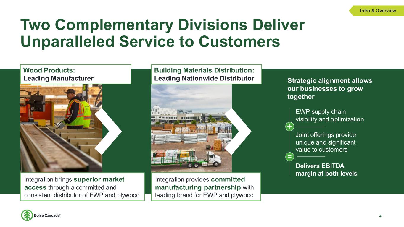 Leading Building Materials Manufacturer and Distributor 347% Total Shareholder Return – Five years ending December 2024* Leading manufacturer of Engineered Wood Products (EWP) & Plywood $1.66 Billion invested in company via M&A/Capex and $1.39 Billion in shareholder returns since 2019 291 bps of improvement in EBITDA margin 2019 vs LTM $6.6 Billion LTM Revenue We serve a diversified array of customer segments from independent dealers to large chains and home centers. National distribution excellence for Boise Cascade products and other leading brands 6.5% CAGR Revenue from 2019 to LTM Intro & Overview 3 *The compar ison assumes $100 was invested for the period star ting December 31, 2019, through the end of the listed year in the Company and in the index, respectively, and assumes d ividends were reinvested in the Company’s stock. LTM –Twelve months ending 6/30/2025