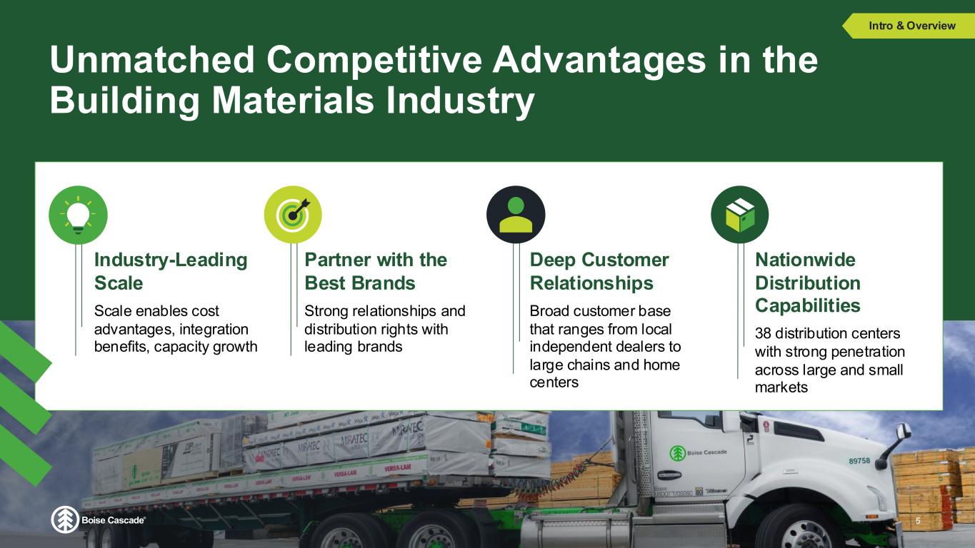 Two Complementary Divisions Deliver Unparalleled Service to Customers 4 Intro & Overview Wood Products: Leading Manufacturer Integration brings superior market access through a committed and consistent distributor of EWP and plywood Integration provides committed manufacturing partnership with leading brand for EWP and plywood Building Materials Distribution: Leading Nationwide Distributor EWP supply chain visibility and optimization Joint offerings provide unique and significant value to customers Strategic alignment allows our businesses to grow together Delivers EBITDA margin at both levels
