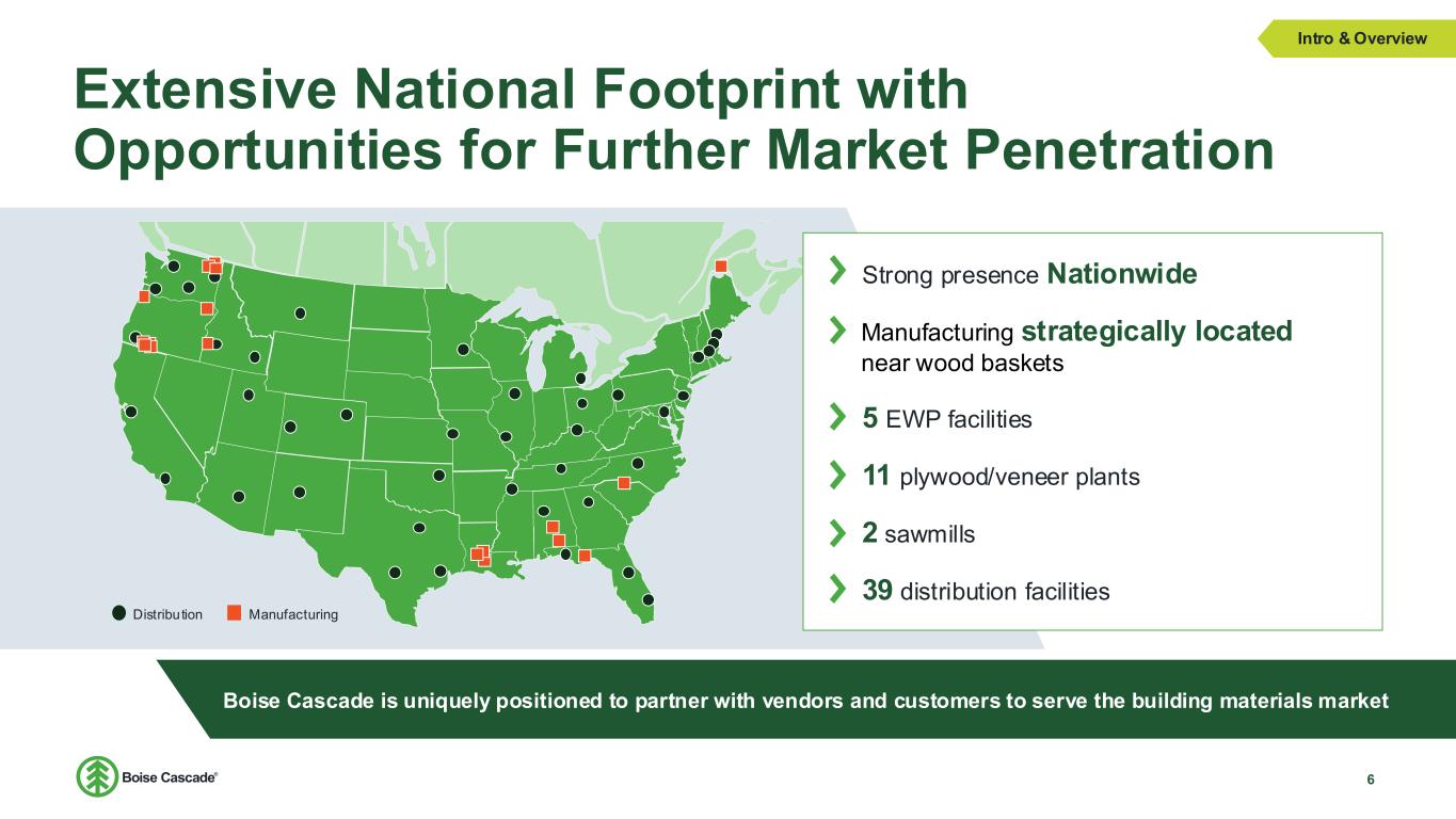 Unmatched Competitive Advantages in the Building Materials Industry 5 Deep Customer Relationships Broad customer base that ranges from local independent dealers to large chains and home centers Nationwide Distribution Capabilities 38 distribution centers with strong penetration across large and small markets Industry-Leading Scale Scale enables cost advantages, integration benefits, capacity growth Partner with the Best Brands Strong relationships and distribution rights with leading brands Intro & Overview