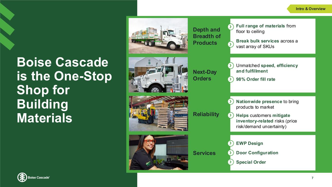 Extensive National Footprint with Opportunities for Further Market Penetration 6 Boise Cascade is uniquely positioned to partner with vendors and customers to serve the building materials market Intro & Overview ManufacturingDistribution Strong presence Nationwide Manufacturing strategically located near wood baskets 5 EWP facilities 11 plywood/veneer plants 2 sawmills 39 distribution facilities
